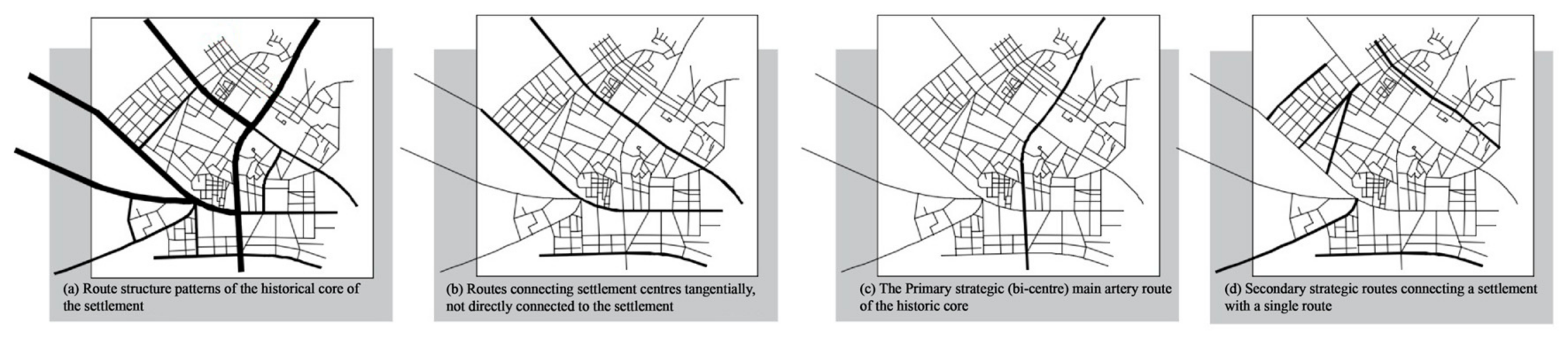 11], where the identification of the streets and routes has provided traces of the spatial development or transformation process in urban tissues. According to Blaut [