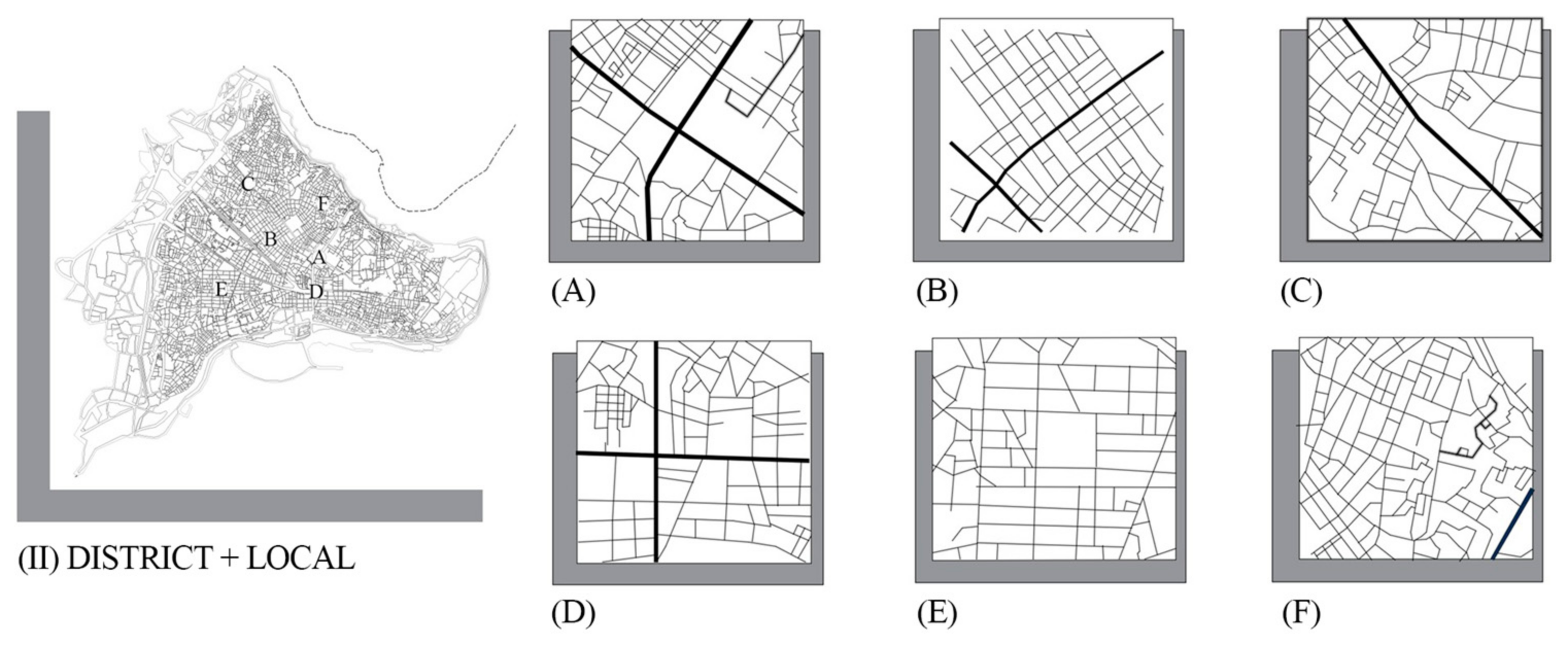 Figure 6)—by considering the prominent street patterns extending from the historical core settlements to the suburbs. The typology shows the characteristics of irregular, sometimes planned or unplanned, street patterns in resolutions from the main axis to the outer areas and settlements. These street networks are distinguished most commonly as follows: the mix of planned and unplanned traditional street patterns associated with T- and X-shaped connections (A); the shape of the street as a complementary grid, but with vertical connections with traditional networks, still creating a more irregular grid-like tissue (B); irregular, narrow, and curved streets, varying in width and going in all directions (C); street patterns coexisting with connective street networks and main arteries, creating dead-end networks that fit together (D); occupying a region with different structural consistency than the traditional model, revealing a characteristic street pattern (E); and some emerging as a grid-like pattern, but evolving to follow a loop and intermittent pattern (F).