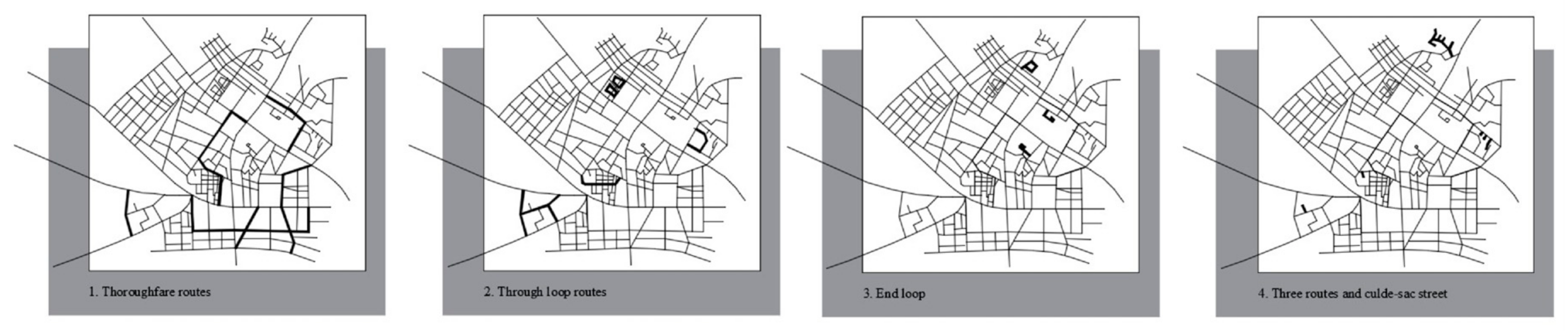 Figure 7 as the following: 1. thoroughfare routes, defined based on a different route at each end—a local route system in which the main axes are linked by different routes at each end; 2. through loop routes, connecting or reconnecting at both ends in the transition loop of the routes; 3. an end loop local route system, linked to another route with only one connection at one end; or 4. a tree-like route composition with a single external link from one end to the other, with all paths being cul-de-sac streets that connect from one end.