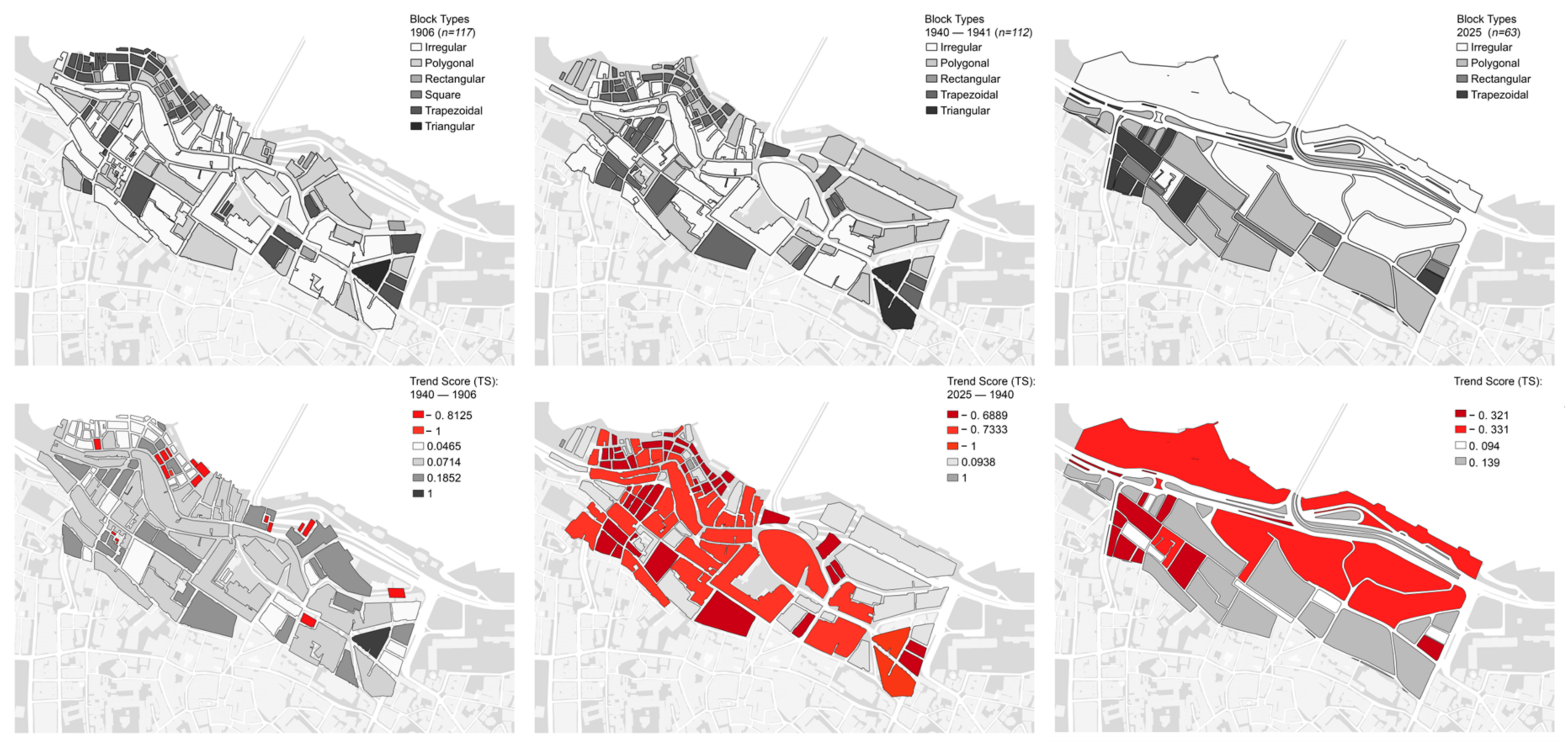 Section 3.4, we have already defined the stability of a block type over time, using a trend score model. Based on human logic, polygonal blocks represented the most stable type; on the other hand, rectangular typology exhibited medium partial stability. Conversely, block types—irregular, square, triangular, and trapezoidal—followed low persistency, with a trend of zero in the case of the square and triangular types.