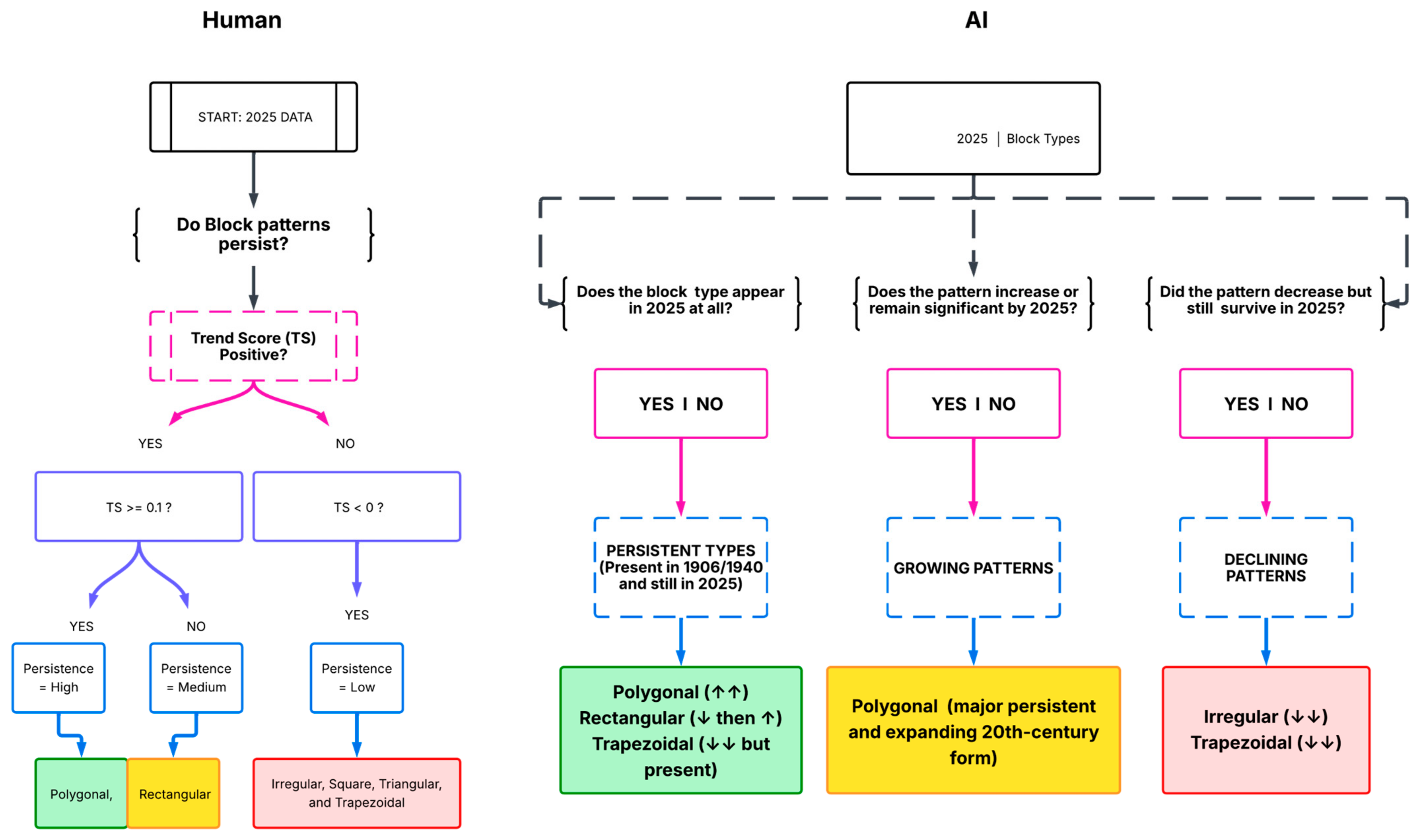Based on the obtained tissue typologies, we asked AI, using a final prompt, to create decision logic that identified which patterns from the 20th century persist over time. This process enabled systematic pattern recognition analysis.