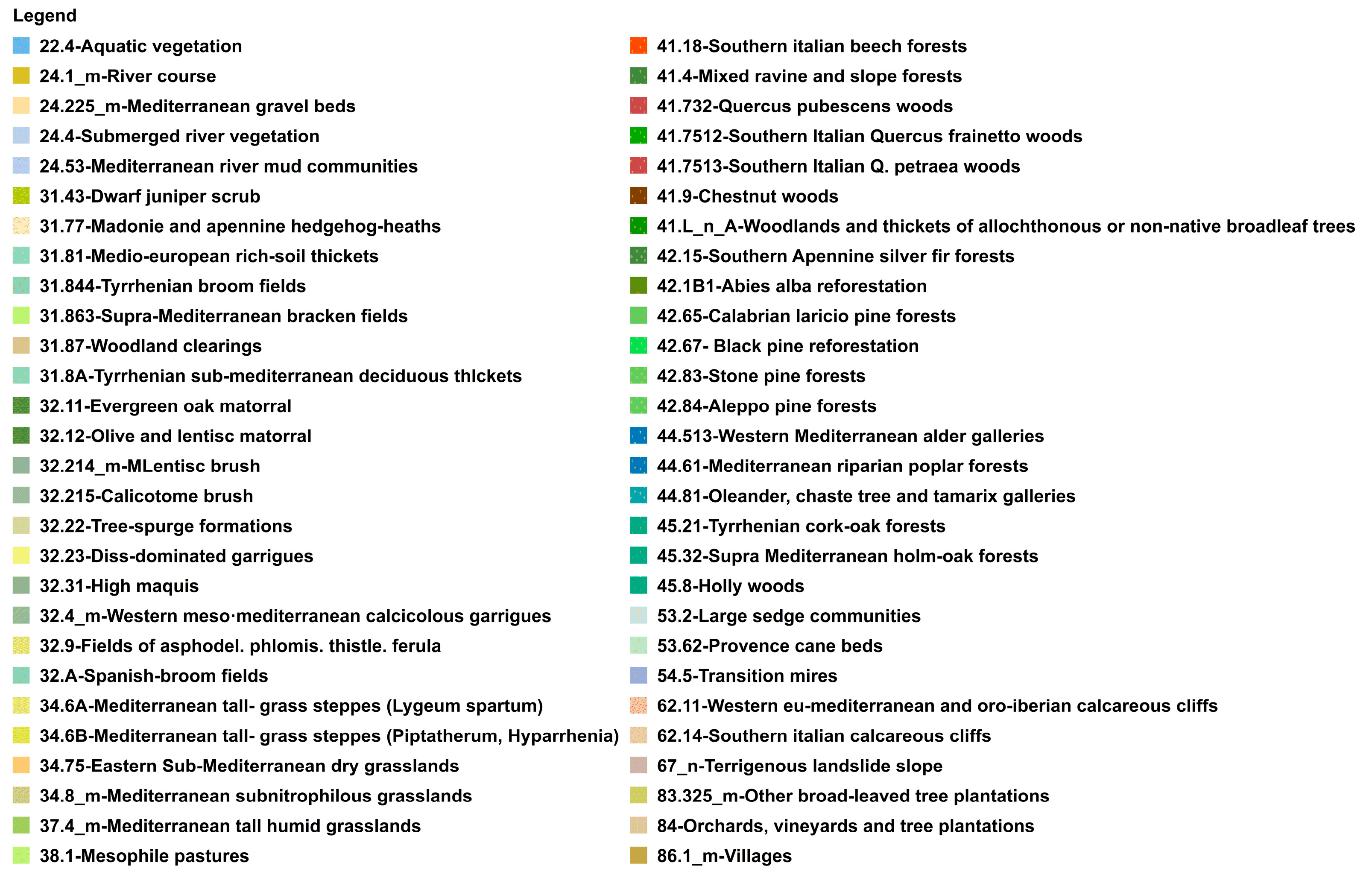 | Patch types | - | - | Discrete, contiguous polygonal units representing a specific habitat type according to the ISPRA/CORINE Biotopes classification system |