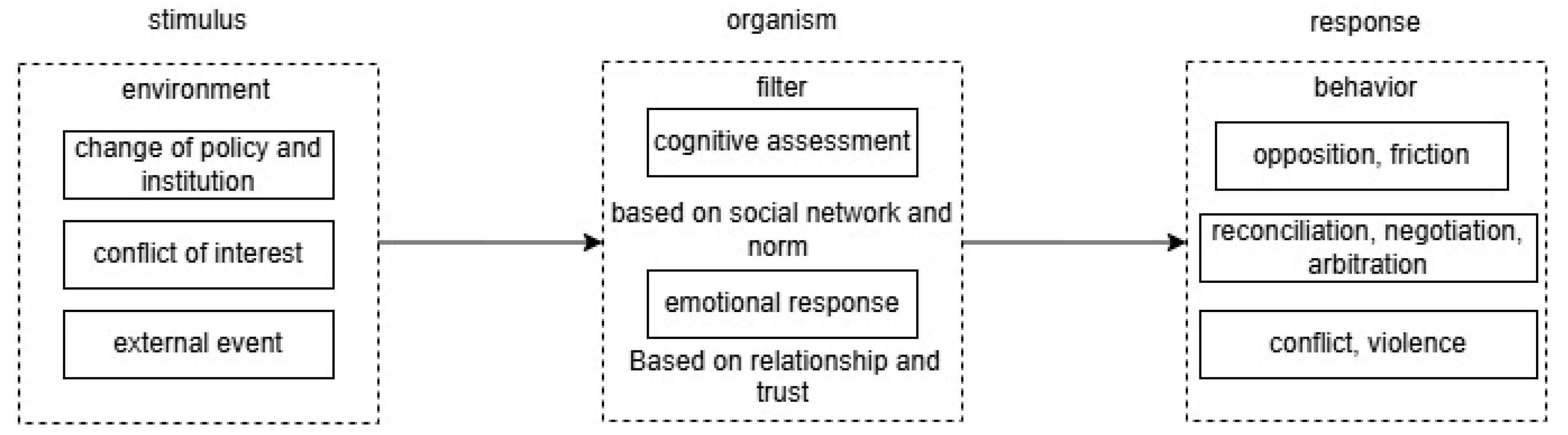 The research model used in this study is based on the Stimulus–Organism–Response (SOR) framework proposed by Mehrabian and Russell (1974) [25]. The SOR framework is primarily used to explore the relationship between environmental stimuli and individual consciousness and behavior. This study uses the SOR framework to analyze the effects of social capital on land disputes. The process of land dispute development is as follows: external stimuli (S) are processed through the internal organic (O) state (cognition, emotion) of individuals or groups, ultimately leading to specific land dispute behaviors (R). Social capital, such as relational networks, trust, and norms, plays a crucial role in the transmission and regulation of cognitive stimuli and emotional development in organisms. The SOR framework is depicted in Figure 1.