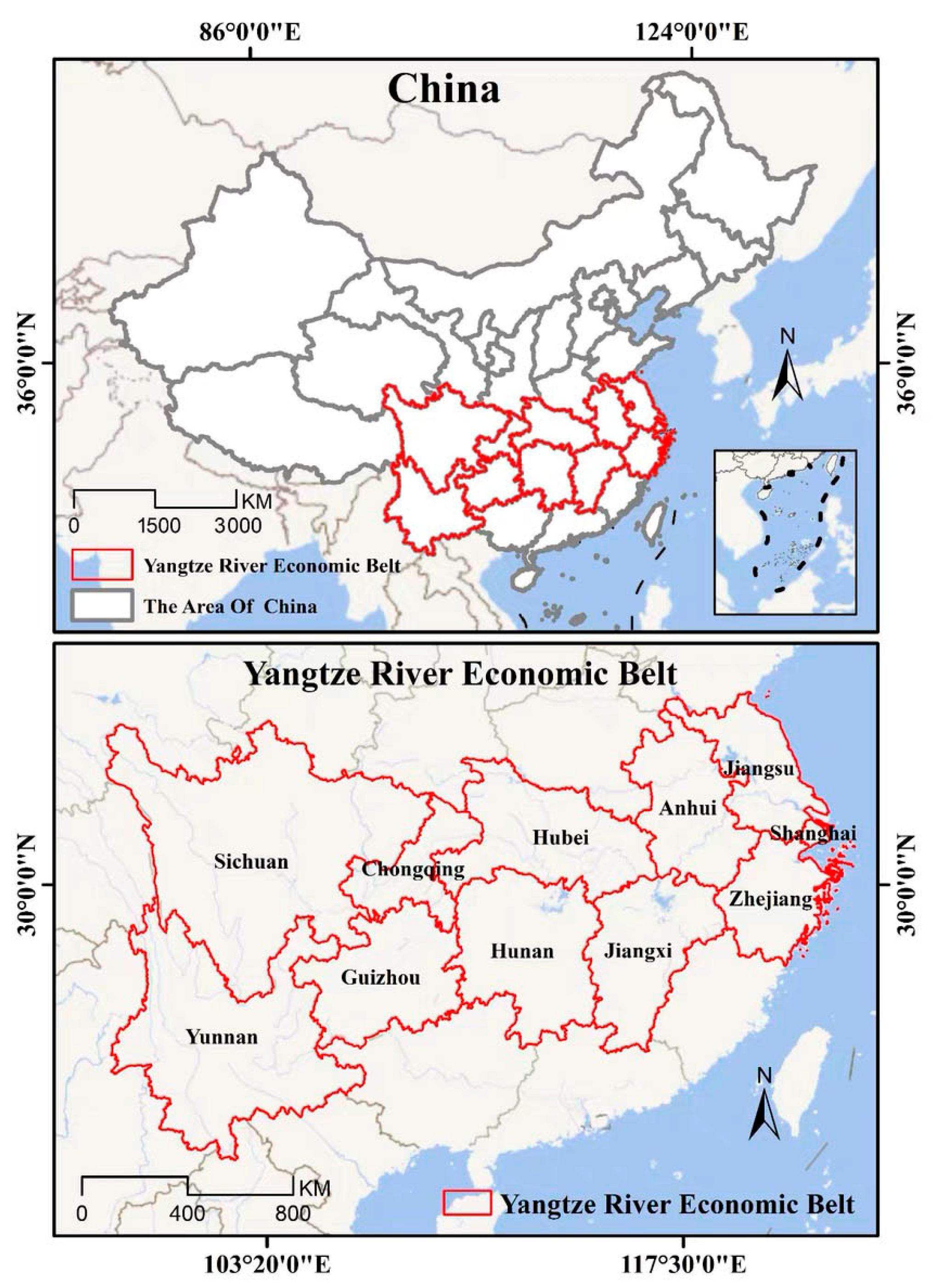 The Yangtze River Economic Belt, situated in southern China, spans the Shanghai and Chongqing Municipalities, as well as Jiangsu, Zhejiang, Anhui, Jiangxi, Hubei, Hunan, Sichuan, Yunnan, and Guizhou Provinces. The belt covers an expansive area of approximately 2,052,300 square kilometers and contributes to over 40% of China’s total GDP. In September 2016, the Outline of the Development Plan for the Yangtze River Economic Belt was introduced to promote the coordinated and high-quality development of regions along the river. This strategy established a new development pattern referred to as “one axis, two wings, three poles, and multiple points” for the Yangtze River Economic Belt.