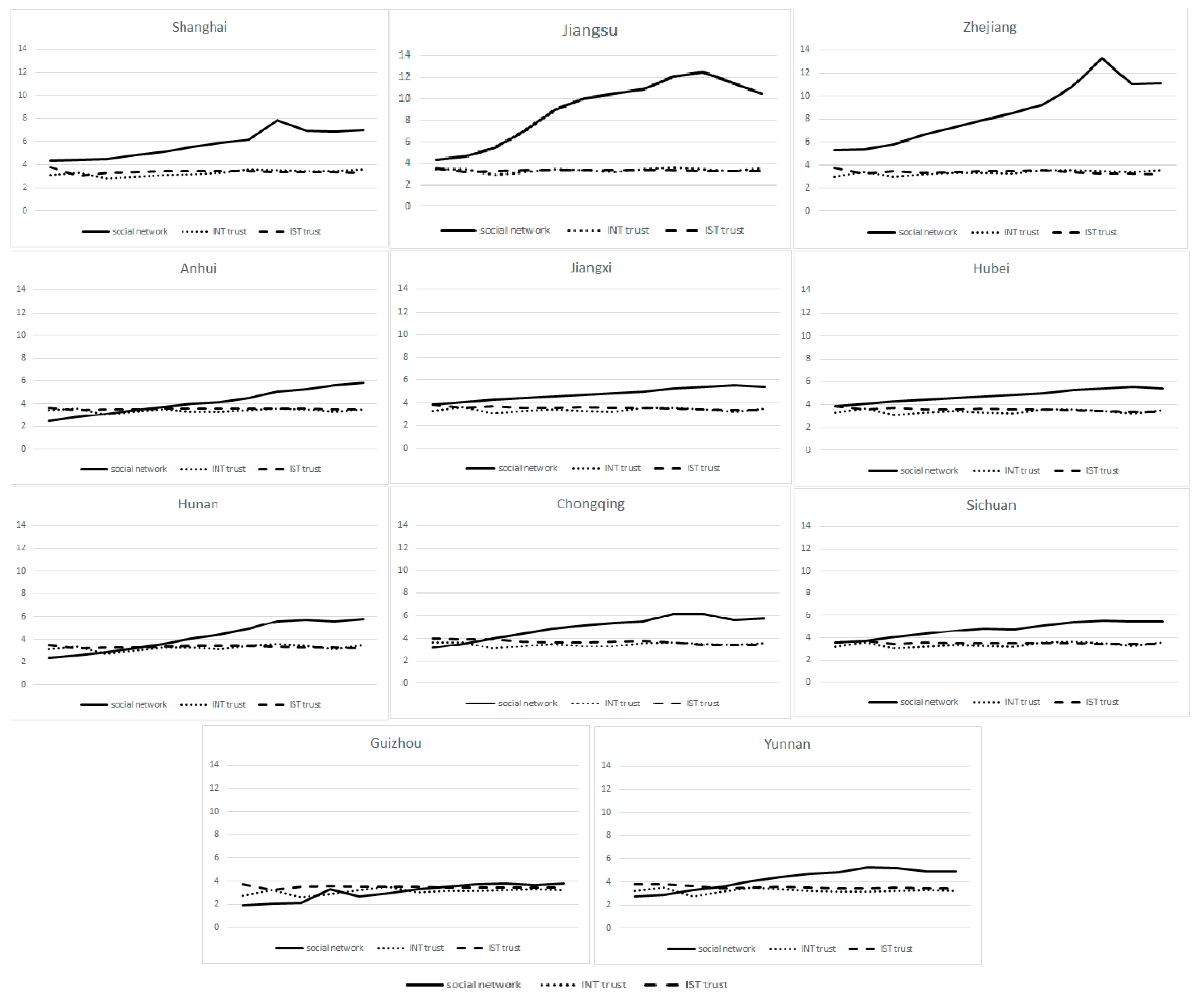 We collected panel data for the core independent variables of 11 provinces in China, spanning 2010 to 2021, and drew a trend chart, as shown in Figure 4. The analysis revealed significant variations in social networks densities among the provinces. The social network density growth rate in eastern China (Shanghai, Zhejiang, Jiangsu Provinces) was relatively high, but it was low in central and western regions. Some provinces exhibited a marked decline in the social network density after 2018. The numerical distribution of interpersonal and institutional trust in each province was relatively consistent and stable.