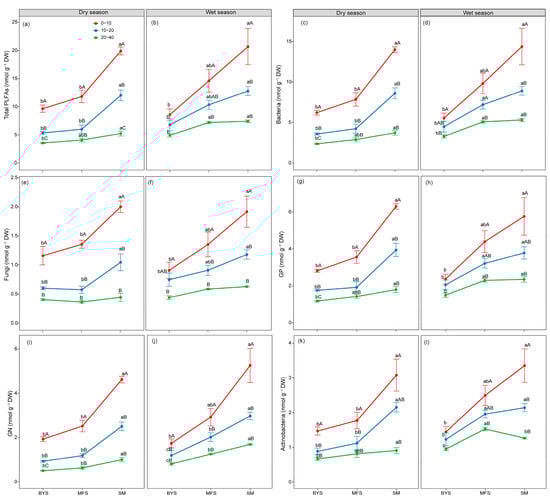 The variations in absolute biomass (nmol PLFA g−1 soil) of total microbial (a,b), bacterial (c,d), fungal (e,f), GP (g,h), GN (i,j), and Actinobacterial (k,l) PLFAs along the urban–suburban–exurban gradient and across different soil layers in the dry and wet seasons. Values are presented as mean ± standard error (n = 4 or 5). Lowercase letters show significant differences between sampling sites in the same soil layer, and uppercase letters represent significant differences between soil layers at the same site (p < 0.05) as determined by Tukey’s post hoc test. GP: Gram-positive bacteria; GN: Gram-negative bacteria.