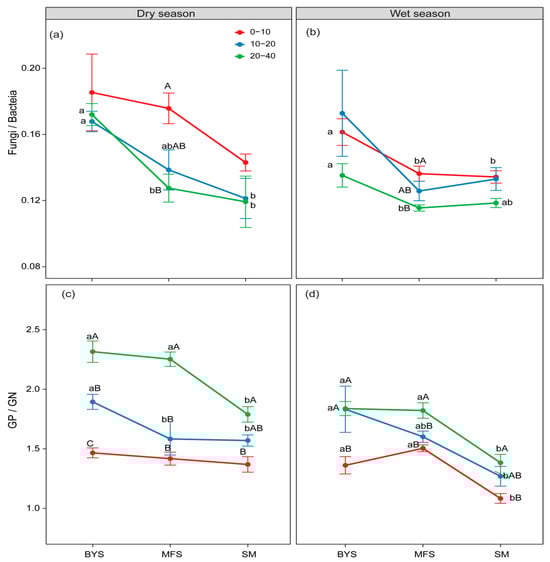 The variations in fungi/bacteria (a,b) and GP/GN (c,d) along the urban–suburban–exurban gradient and across different soil layers in the dry and wet seasons. Values are presented as mean ± standard error (n = 4 or 5). Lowercase letters show significant differences between sampling sites in the same soil layer, and uppercase letters represent significant differences between soil layers at the same site (p < 0.05) as determined by Tukey’s post hoc test. GP: Gram-positive bacteria; GN: Gram-negative bacteria.