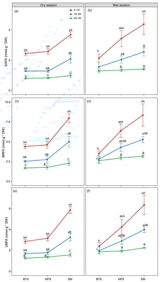 The variations in absolute biomass (nmol PLFA g−1; soil) of SAFAs (a,b), BRFAs (c,d) and UNFAs (e,f) along the urban–suburban–exurban gradient and across different soil layers in the dry and wet seasons. Values are presented as mean ± standard error (n = 4 or 5). Lowercase letters show significant differences between sampling sites in the same soil layer, and uppercase letters represent significant differences between soil layers at the same site (p < 0.05) as determined by Tukey’s post hoc test. BRFAs: saturated fatty acids with branches; SAFAs: saturated fatty acids without branches; and UNFAs: unsaturated fatty acids.