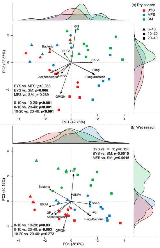 The principal component analysis (PCA) of the relative biomass of different microbial groups (normalized, accounting for 66.33% and 68.7% of the variations in dry and wet season, respectively; Figure 6) was roughly separated by site and soil depth. The relative biomass of GN, GP/GN, F/B, fungi, and bacteria contributed more to such variation patterns. Specifically, PC1 and PC2 explained 42.76% and 23.57% of the total variance in the dry season, respectively (Figure 6a). Samples from different soil depths were clearly separated along the principal components, indicating that soil depth had a significant influence on microbial communities (p < 0.001). In contrast, differences between sites were limited; for example, BYS and SM differed significantly (p = 0.006), while no significant differences were found between BYS and MFS (p = 0.368) or between MFS and SM (p = 0.289). During the wet season (Figure 6b), PC1 and PC2 accounted for 38.6% and 30.19% of the variance, respectively. The separation of samples by soil depth remained evident, such as significant separation between 0 and 10 cm and 10–20 cm (p = 0.03) and between 0 and 10 cm and 20–40 cm (p = 0.003), but there was non-significant separation between 10 and 20 cm and 20–40 cm (p = 0.273). During the wet season, site differences became more pronounced. This was evidenced by highly significant differences between BYS and SM (p = 0.0015) and between MFS and SM (p = 0.0015).