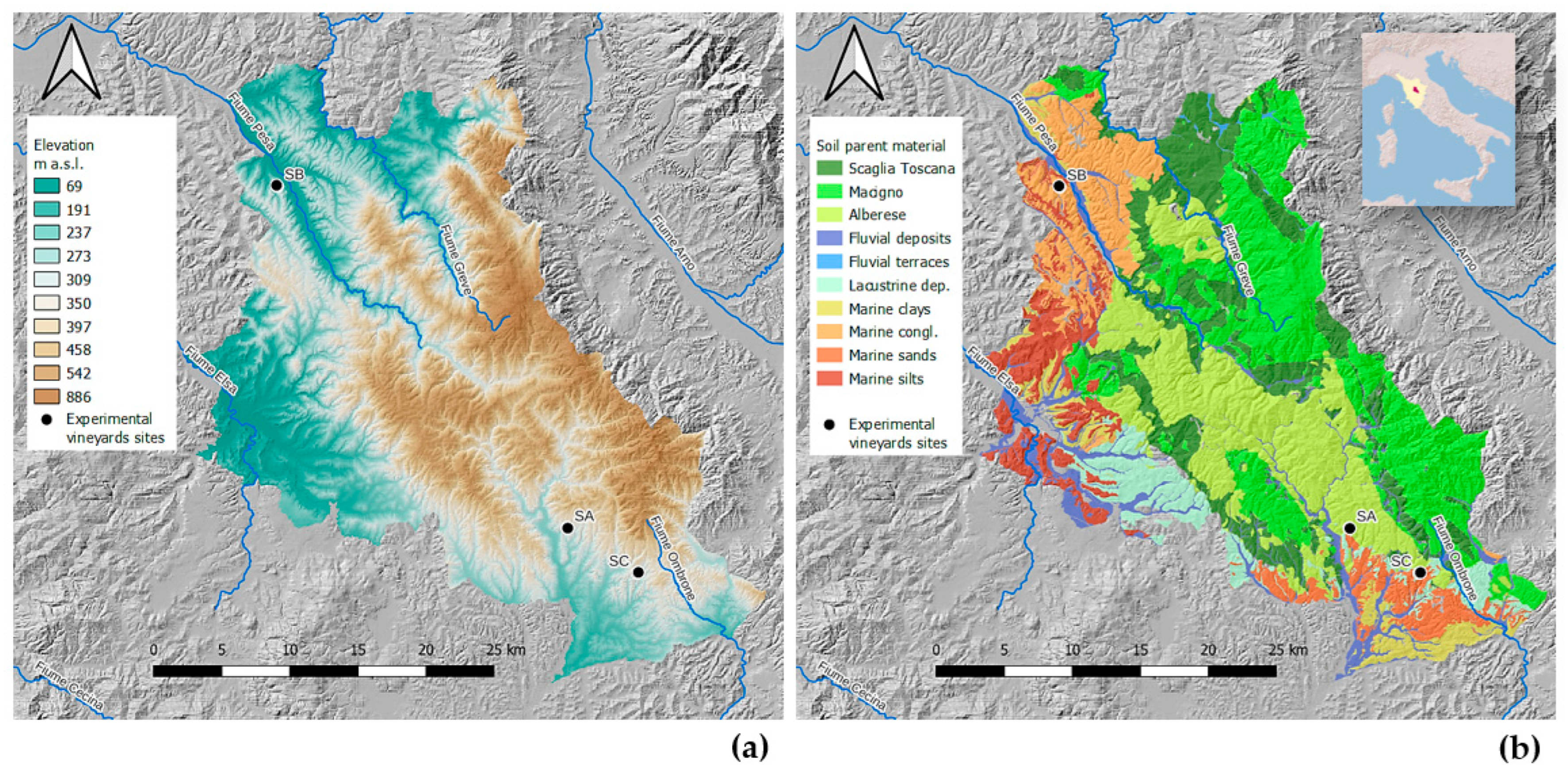 - Regione Toscana DataBase Pedologico. Available online: https://www502.regione.toscana.it/geoscopio/pedologia.html (accessed on 10 December 2025).