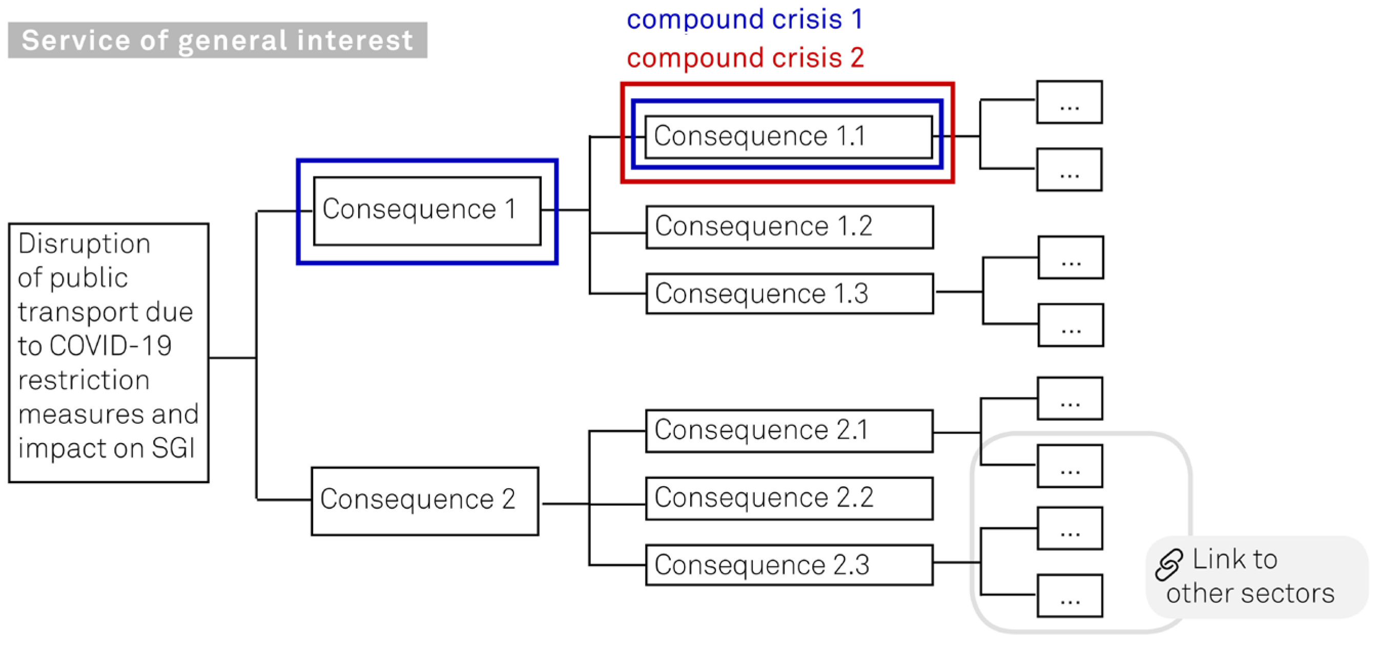 Figure 1 schematically illustrates the basic structure of the cascading effect chains used in the study. Each diagram is composed of three main types of elements: (i) an initial disruption node (e.g., reduction in public transport services); (ii) intermediate nodes describing sector-specific consequences for service provision and staff; and (iii) outcome nodes indicating impacts on different user groups (e.g., low-income households, migrants, people with chronic illnesses). Furthermore, compound effects can be visualized by highlighting the effects of multiple crises (see