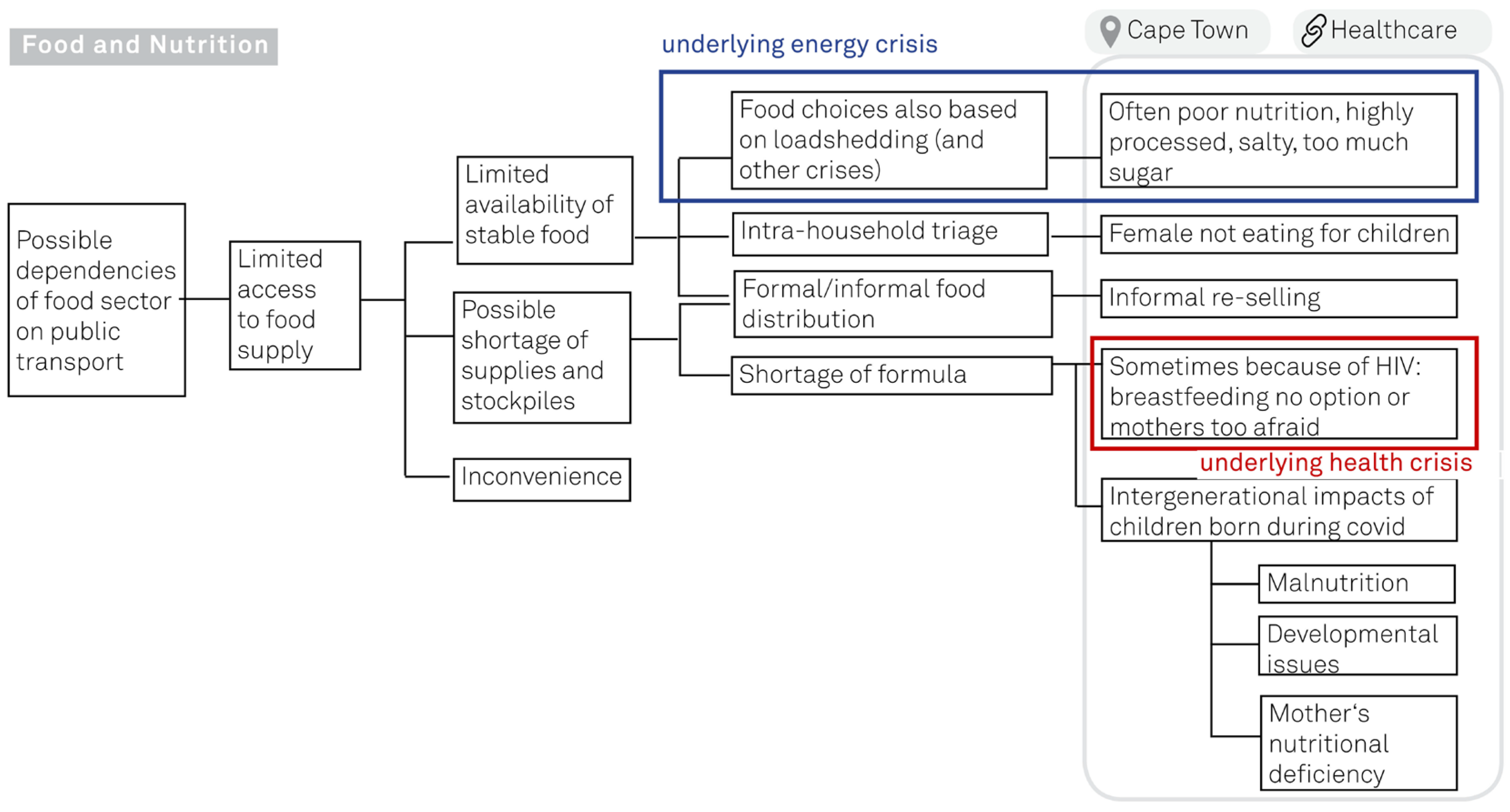 One of the most significant strengths of the cascading effects approach lies in its capacity to uncover cross-sectoral dynamics that are often overlooked. In each of the three case study cities, the analysis helped bring to light indirect consequences that fell between administrative responsibilities or institutional remits. For instance, in Cape Town, while health officials may have focused on the availability of care facilities, the cascading diagram revealed how energy insecurity (load shedding) not only affected medical equipment but also compromised food refrigeration and the operation of early childhood development centers, further intersecting with challenges around nutrition, childcare, and educational continuity.
