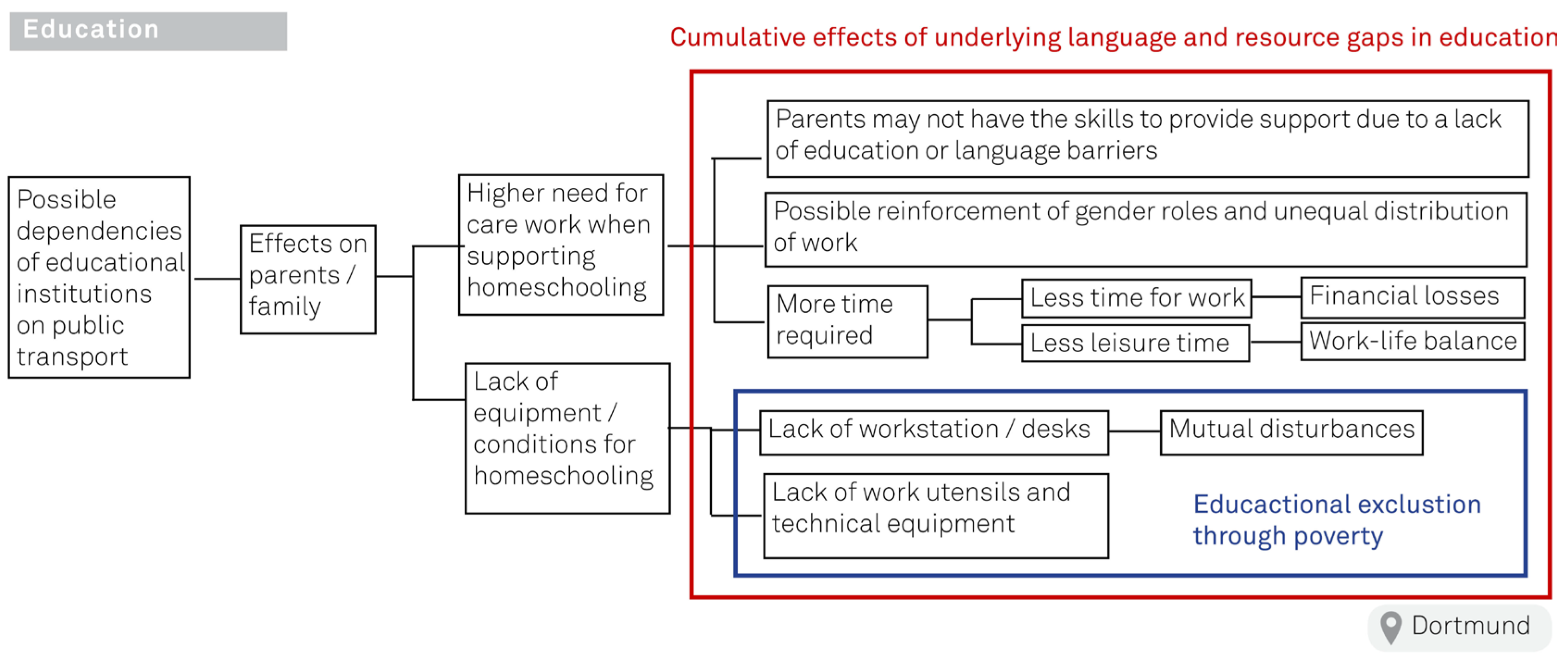 Figure 3 shows an excerpt from the empirically derived cascading-effects diagram for the Dortmund case: each box and arrow synthesizes statements from interviews and workshops on how language barriers, homeschooling conditions, and poverty interacted, and should be read as an empirically informed visualization of these cumulative effects rather than as a general schematic of the socio-spatial context.