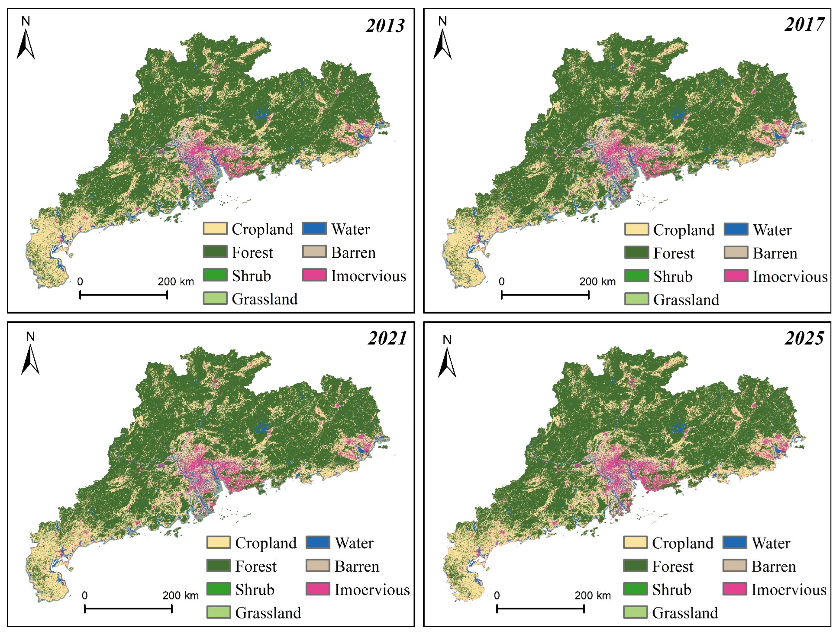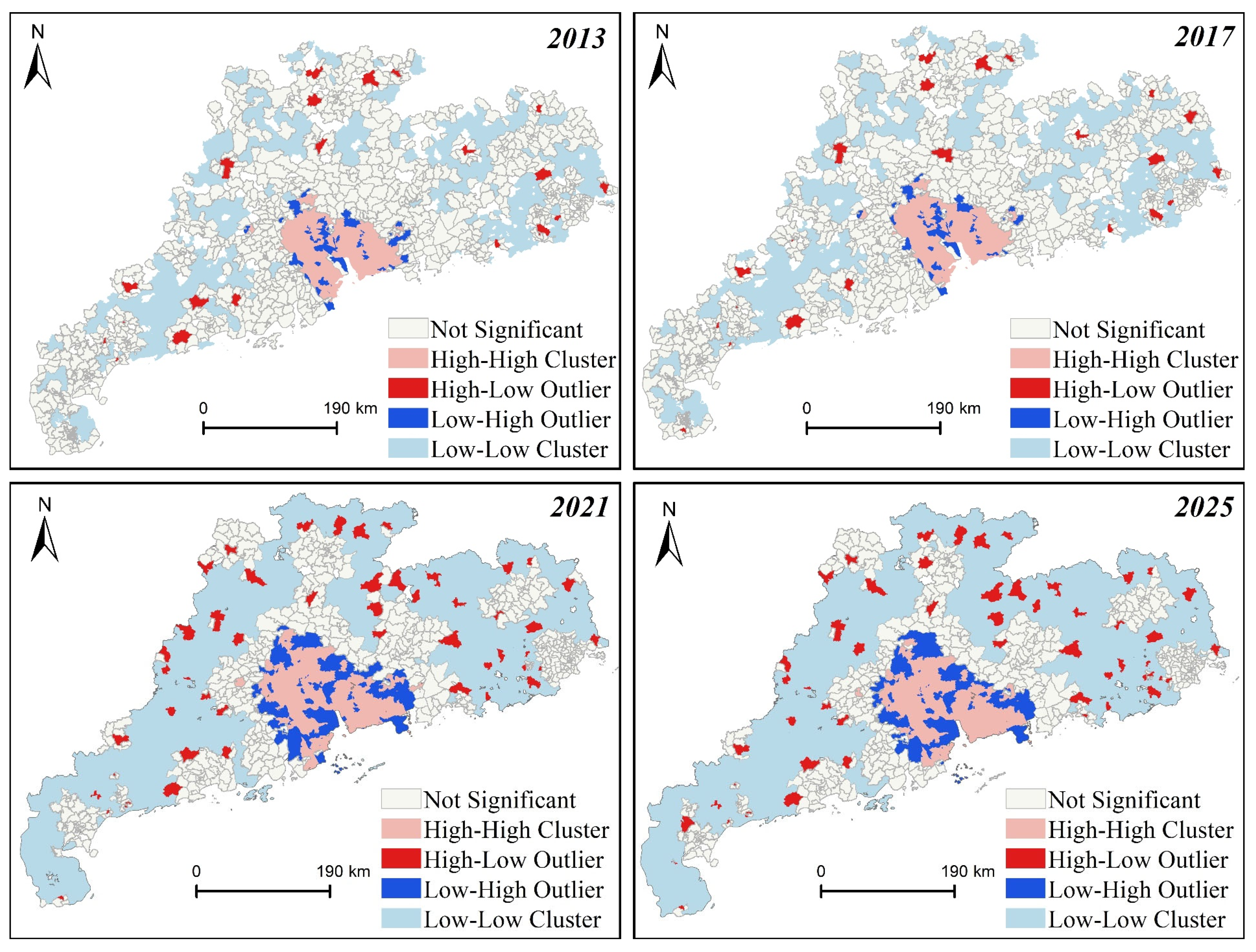From 2017 to 2021 is a period characterized by a smooth transmission chain driven by policy, leading to accelerated improvement in common prosperity. With the implementation of Guangdong Province’s public service equalization policy, the focus of urban–rural integration shifts from factor agglomeration to universal access to resources. The industrial spillover effects of Pearl River Delta core cities begin to appear. Surrounding areas, while undertaking industrial transfers, receive more investment in public service resources, driving an increase in LH clusters. Meanwhile, Pearl River Delta core cities further consolidate the scope of HH clusters by optimizing their public service structure. The key in this stage is that policy intervention unblocks the transmission path from integration to prosperity, transforming the outcomes of urban–rural integration into a tangible welfare improvement for residents.