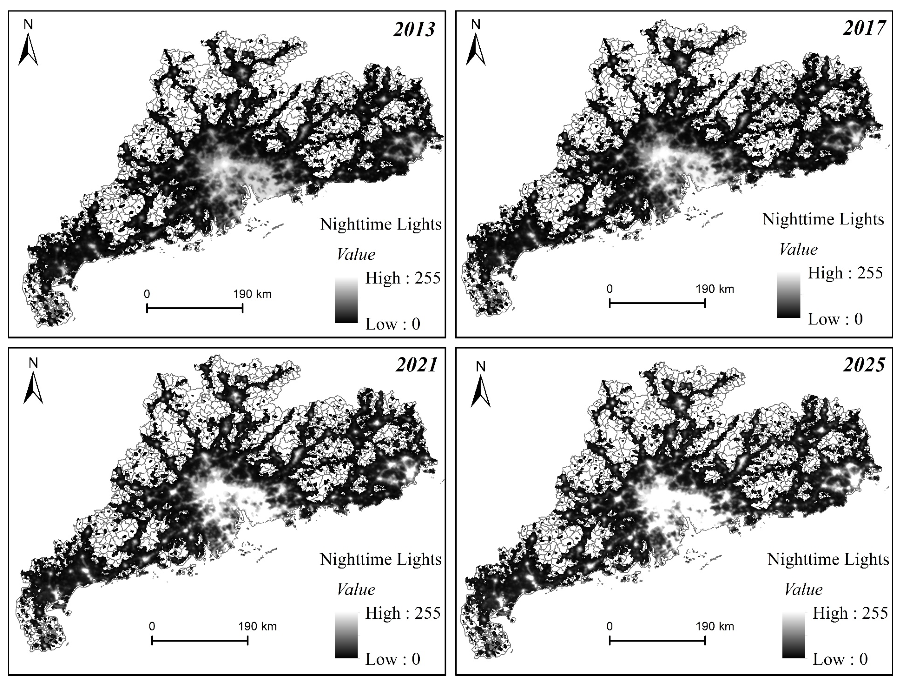 Based on the analysis of land use data for urban–rural spatial changes in 2013, 2017, 2021, and 2025, it can be observed that the urban–rural spatial pattern underwent significant changes during the study period. Overall, the scale of urban built-up land continued to expand, showing distinct outward expansion characteristics, with urban boundaries continuously extending into surrounding areas. In contrast, changes in rural built-up land and agricultural land were relatively slow, with some areas exhibiting a trend of being encroached upon by urban space or undergoing functional transformation. These results indicate that the urban–rural spatial structure underwent substantial adjustment during the study period, with the dominant role of urban space in the overall spatial pattern continuously strengthening. Further analysis of urban–rural spatial differences based on NTL data reveals that, as shown in