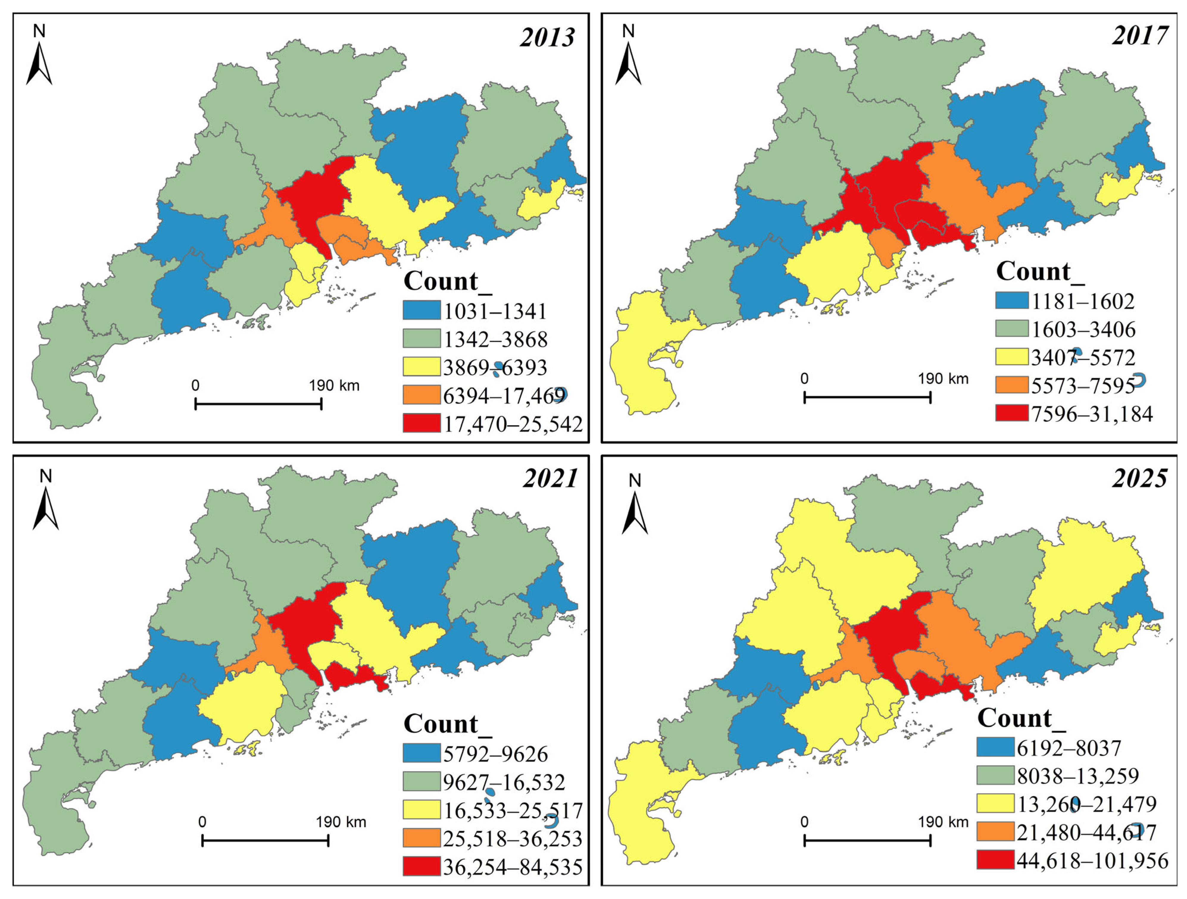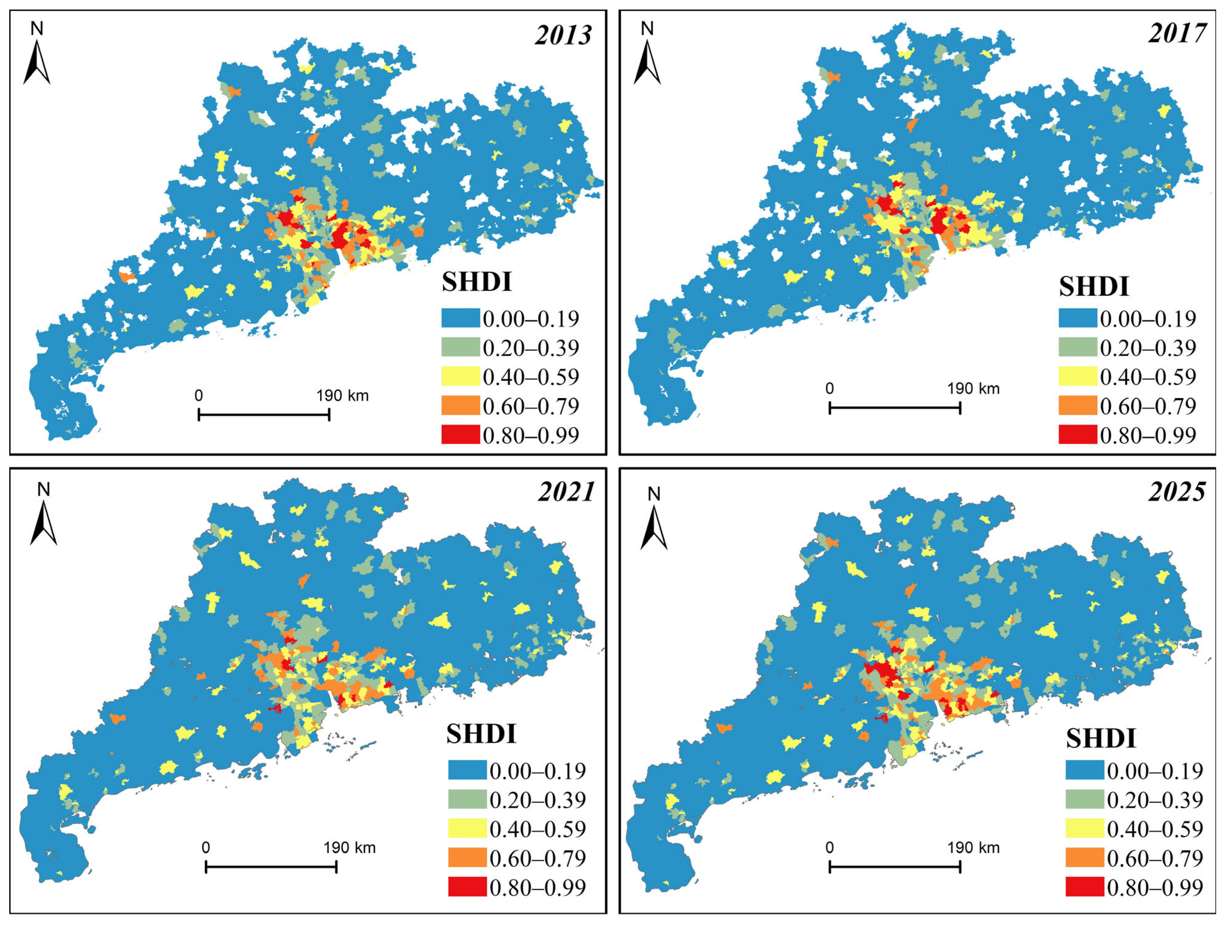 Figure 6. Overall, areas with high diversity index values are mainly concentrated in the Pearl River Delta region, and within non-Pearl River Delta areas, they are primarily distributed in municipal and county-level central urban areas. In contrast, vast rural areas far from central urban areas generally have low diversity index values. This spatial pattern indicates that significant gaps still exist between different regions and different spatial levels in terms of public service provision, living convenience, and development opportunities. The degree of achieving common prosperity varies markedly across space. From the perspective of temporal evolution, the POI facility diversity index shows differentiated change characteristics across different periods. During the period from 2017 to 2021, the overall increase in the diversity index was the largest, reflecting the most pronounced rise in the level of common prosperity during this stage. In comparison, changes in the diversity index were relatively moderate during the remaining periods, with limited overall improvement, indicating a relatively weaker degree of improvement in the level of common prosperity during these two phases.