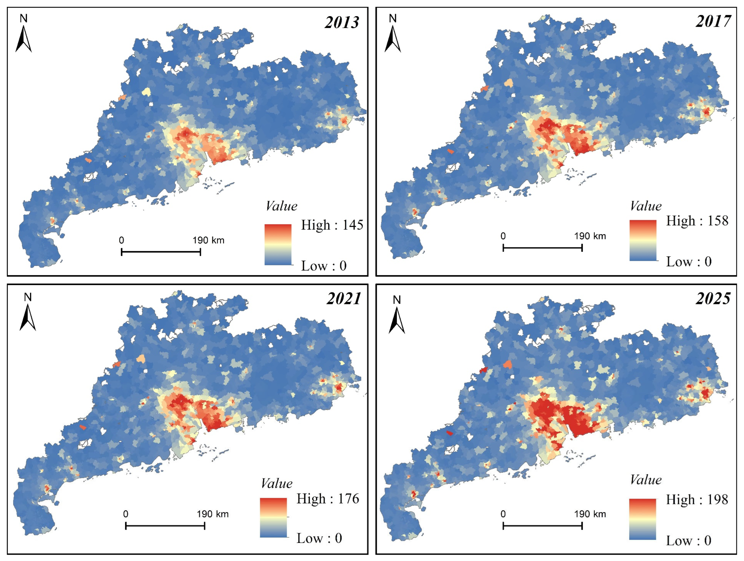Figure 5, the intensity of urban–rural economic activities showed a continuous upward trend from 2013 to 2025, reflecting the overall improvement in economic levels and residents’ income levels in the study area. However, this upward trend exhibited significant spatial imbalance among different spatial units. In urban areas, especially the core cities of the Pearl River Delta, the increase in NTL intensity was substantial, demonstrating highly concentrated economic activities and rapid income growth. In contrast, non-core cities and vast rural areas also saw an increase in NTL intensity, but the rate of growth was relatively limited. The disparities between urban and rural areas, as well as among different regions, did not show a corresponding synchronous reduction.