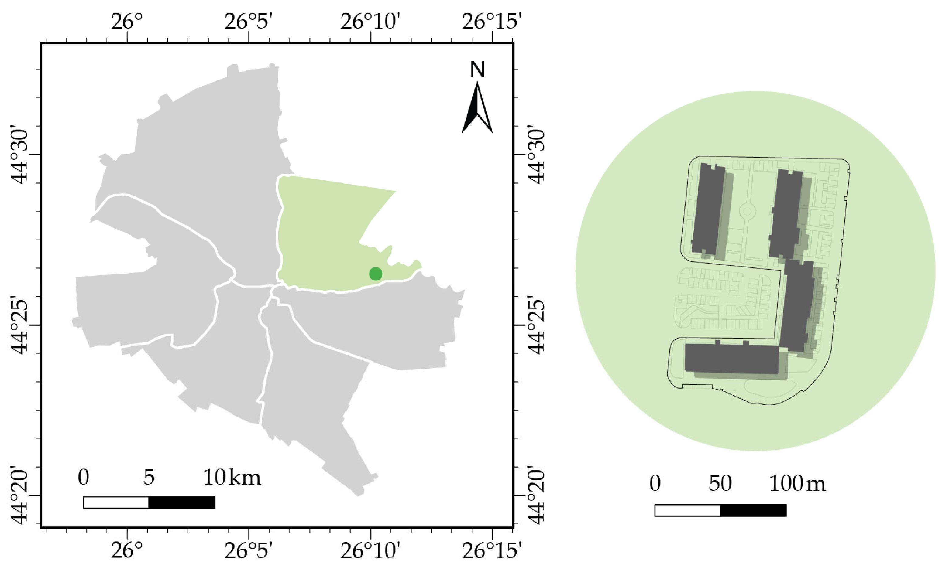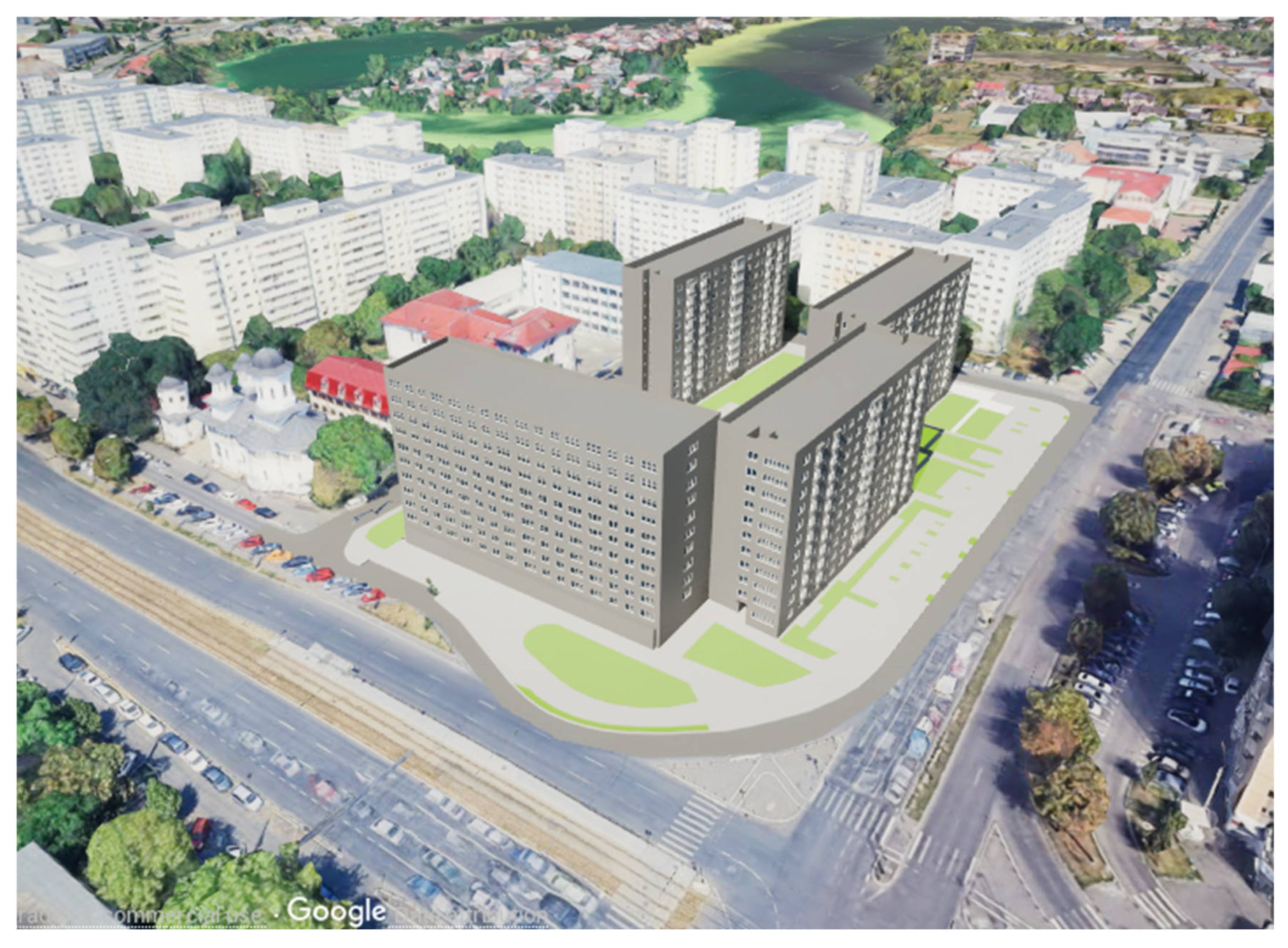 The area is located in District 2 of Bucharest, in the Pantelimon neighborhood (Figure 1). Initially, the area’s built environment consisted of modest, single-story houses without running water or sewage systems. Starting in 1965, the development of collective socialist housing led to widespread demolitions of small-scale buildings. With the political and economic interests dictating urban planning during the 1970s, the Pantelimon neighborhood was designed to ensure equal living conditions, access to public transportation, and nearby employment opportunities.