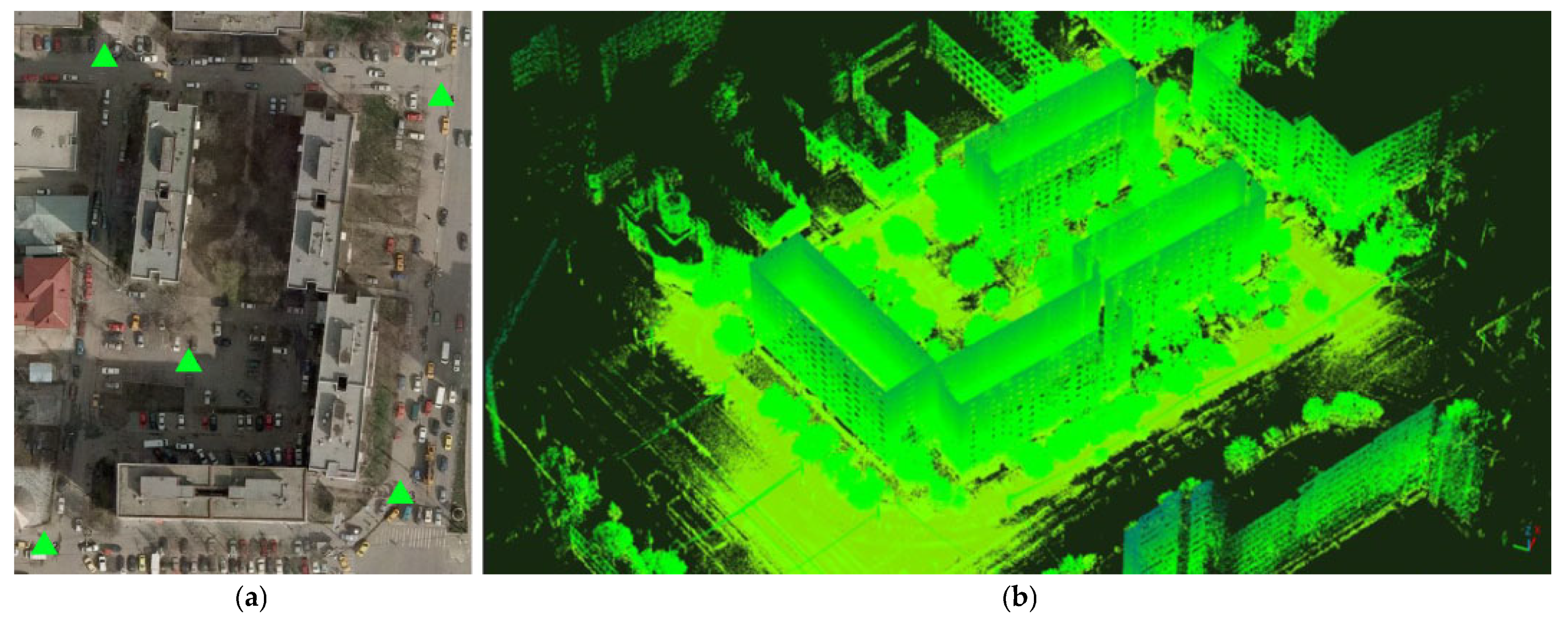 Figure 2. (a) Ground control points on site, symbolized by green triangular markers; (b) point cloud resulted after laser scanning.