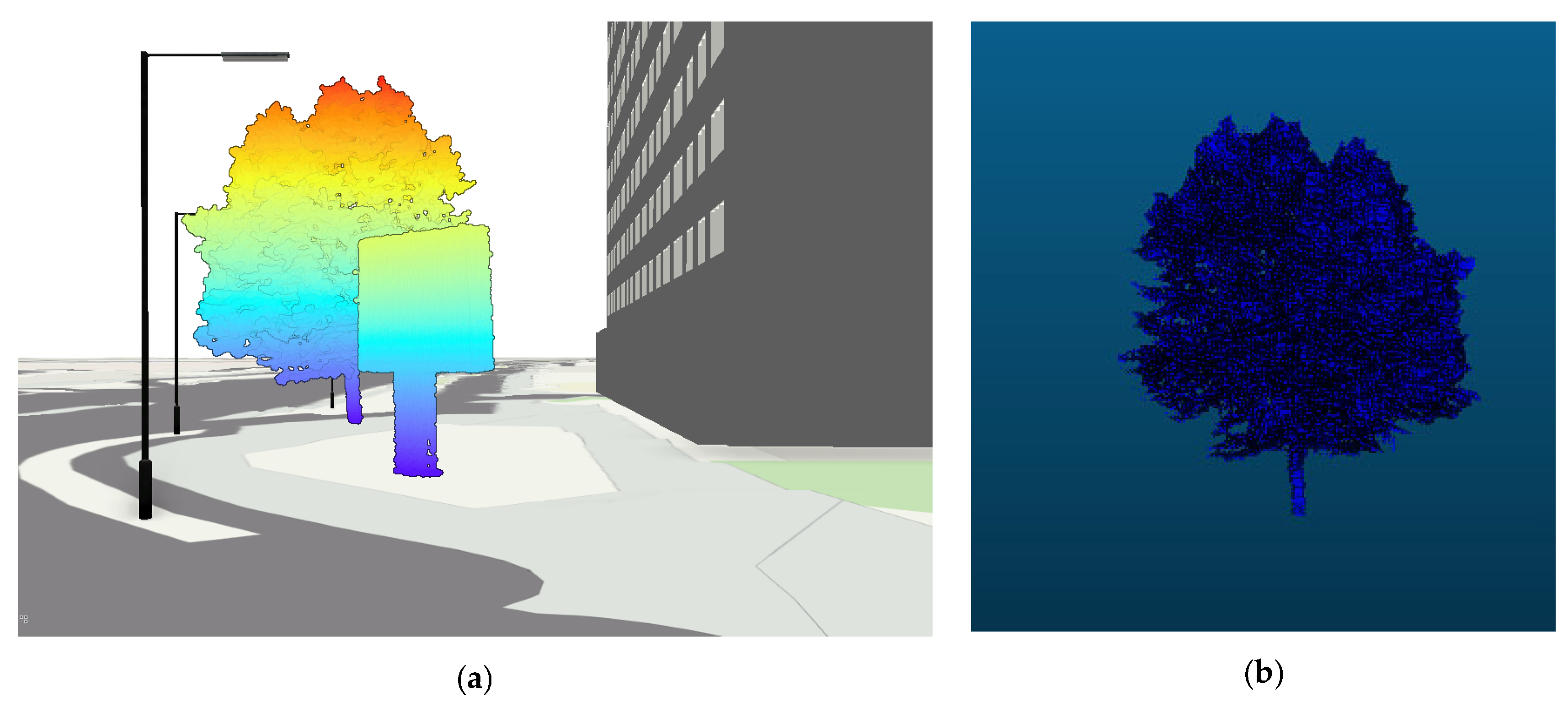 Figure 5. (a) Tree and billboard isolated point clouds in GIS; (b) isolated tree point cloud.