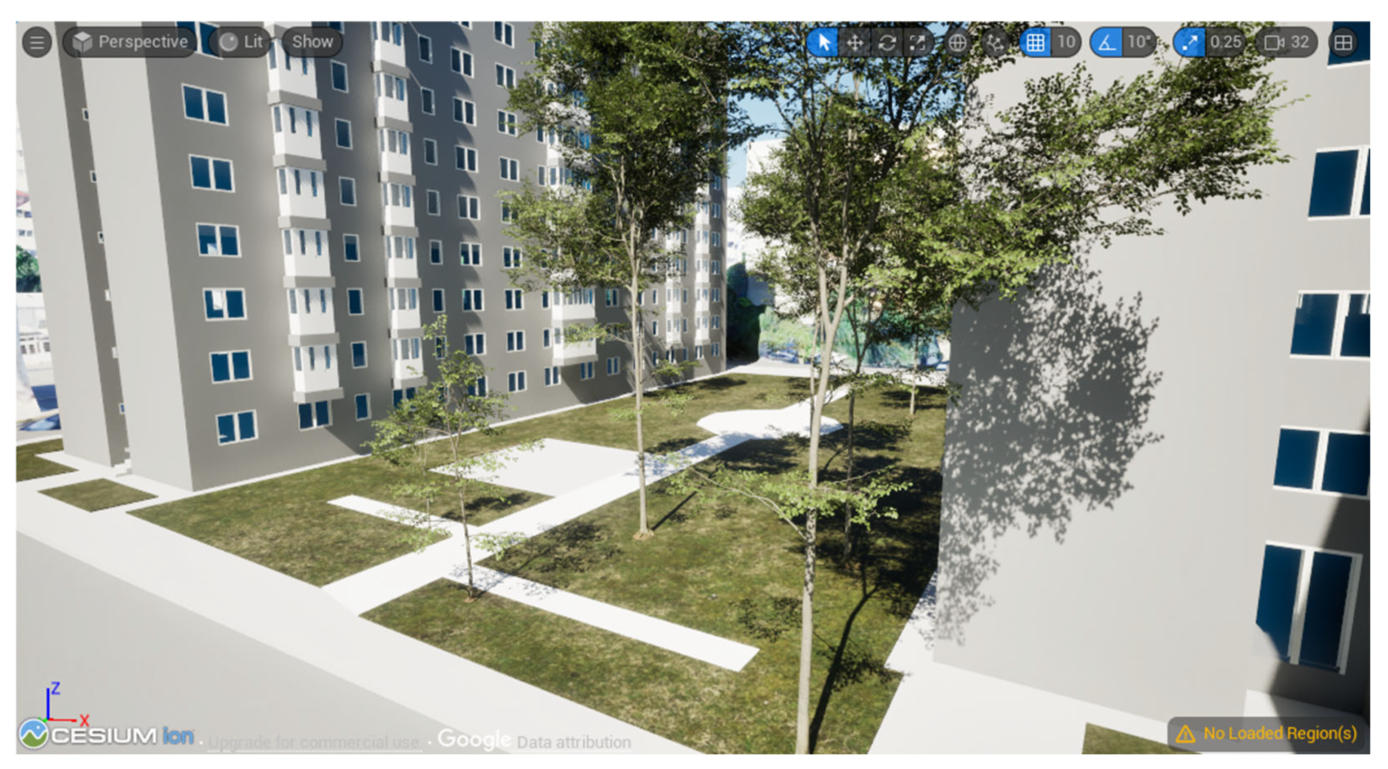 Cesium ion SaaS is a 3D geospatial data platform. It can be used as a plugin for Revit and UE5. With the Cesium ion platform, 3D data can be uploaded to the cloud and optimized as 3D tiles [41]. Cesium ion enriches Unreal Engine 5 (UE5) with tools that provide global context, including Cesium World Terrain, Bing Maps imagery, and Cesium OpenStreetMap (OSM) Buildings [42]. CesiumSunSky provides the real-world position of the Sun to add realism to the created scene. The geospatial accuracy of natural light provides an appropriate context for urban planning. In addition to converting to 3D tiles (Figure 7c), a 3D model can be imported directly into UE5 as an IFC model.