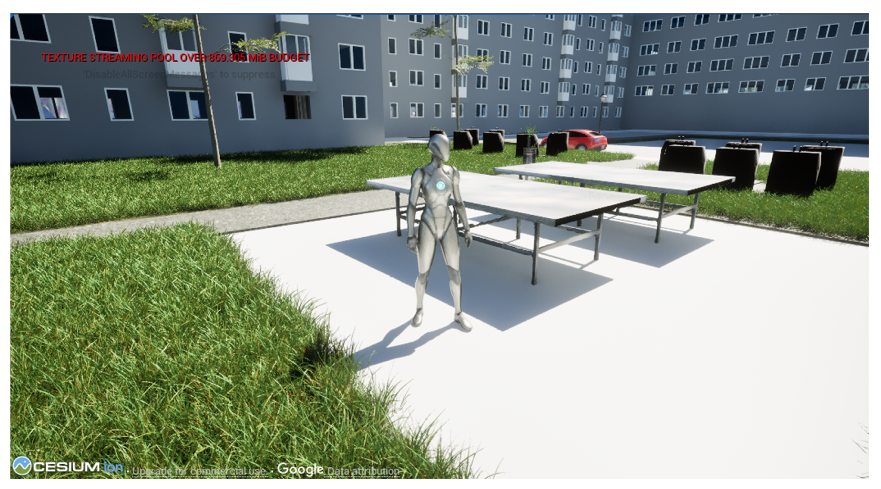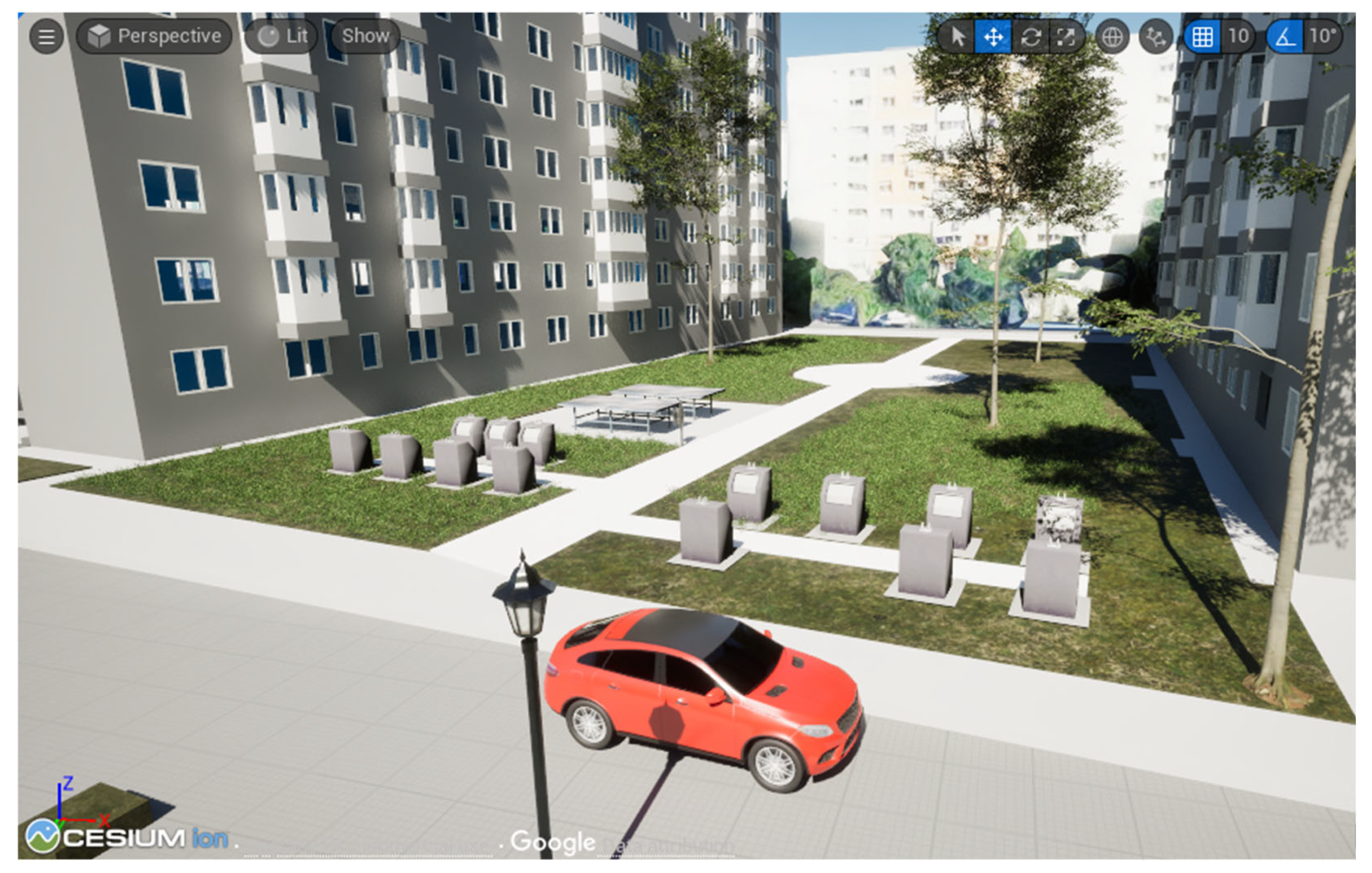 The scene (Figure 12) included urban objects such as light poles, recycling bins, trash cans, ping-pong tables, and cars. These objects were selected from the FAB marketplace, which offers both free and paid 3D models.
