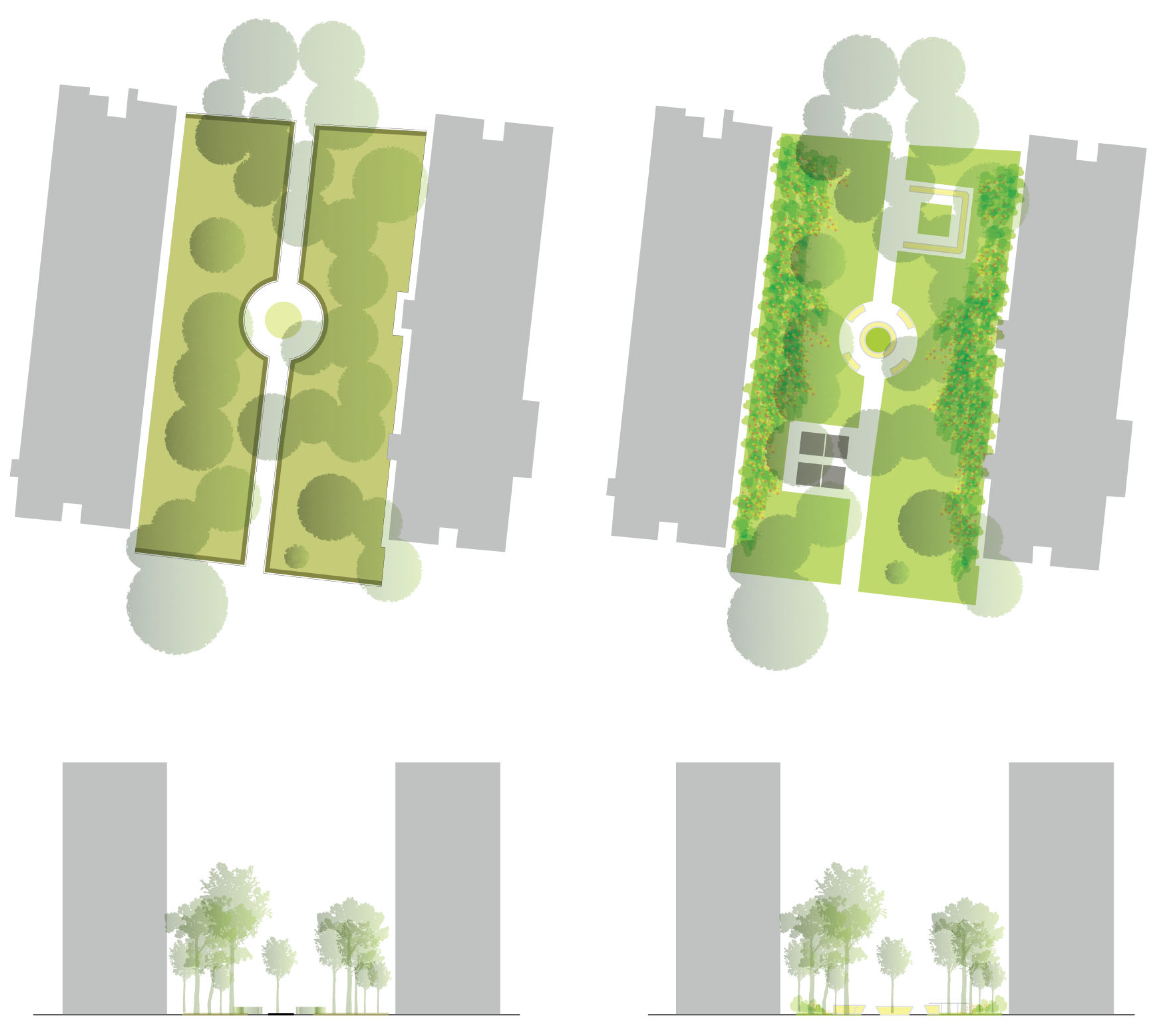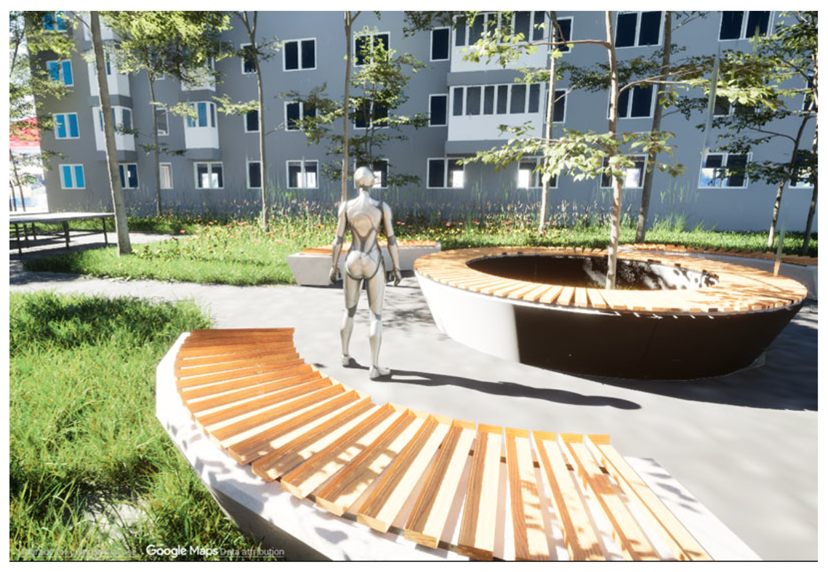To highlight the potential of the two platforms, two scenarios for the courtyard between the apartment buildings were developed using GIS and game engine software. The first scenario depicts the site’s current state. The green spaces are overgrown and surrounded by metal fences and hedges, making them inaccessible to locals. Solely the alley is accessible, but it is still blocked in the center by two outdoor carpet hangers. The second scenario aims to transform the courtyard into a social, inclusive space for the community. Green spaces are accessible because the spatial delimitations were eliminated. To protect the privacy of the first-floor residents, the proposal calls for taller plants that decrease in height towards the center of the landscaping. Since the tree canopy covers an extensive part of the courtyard, landscape design is limited to the ground level. The second scenario introduces three outdoor areas that would benefit the community: a recreational space in the center of the courtyard, an activity area with ping-pong tables, and a community garden. Figure 13 presents the conceptual sketches for the two scenarios.