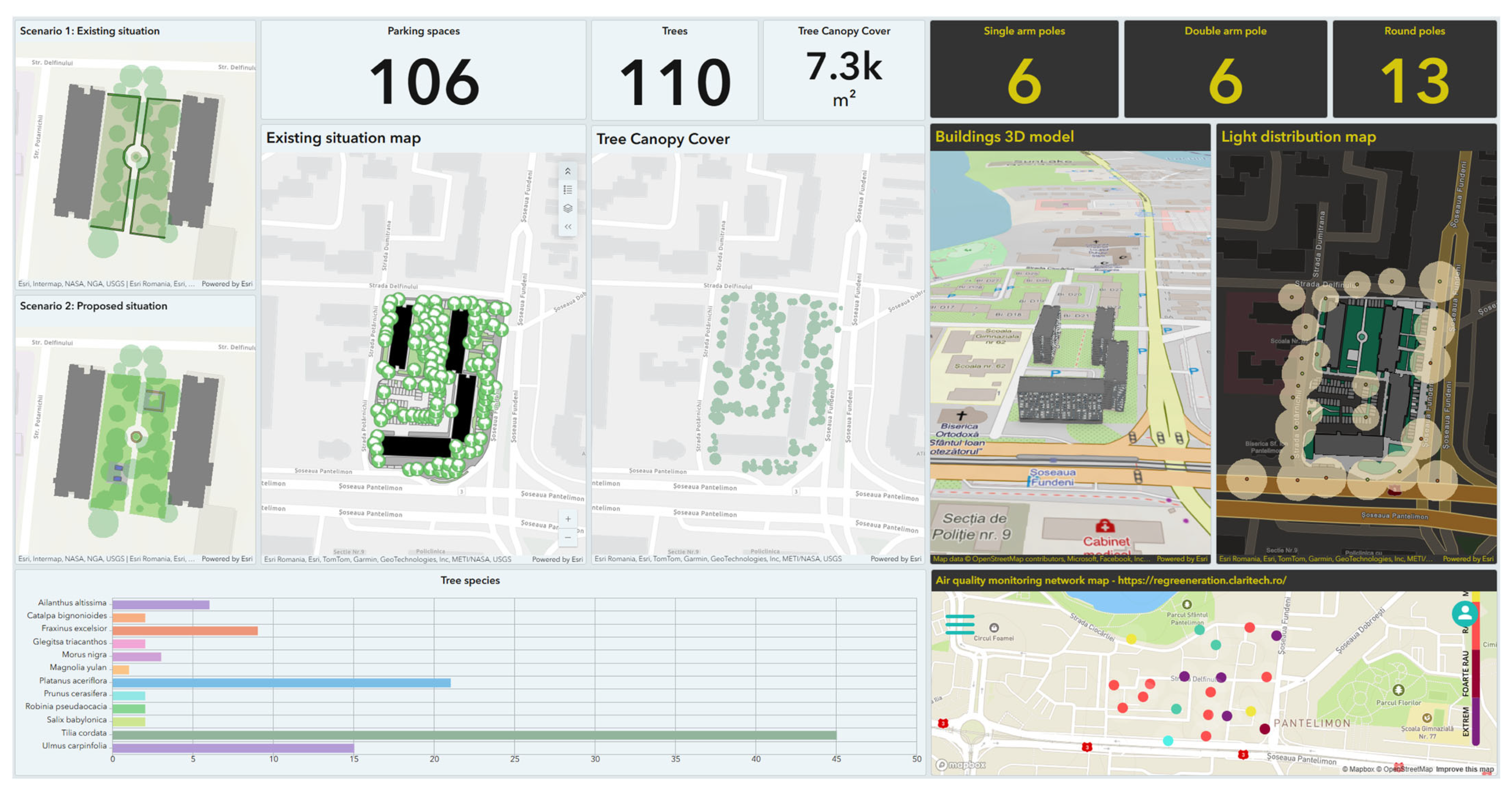 The first 2D digital representation in the dashboard illustrates the existing situation, including building footprints, parking spaces, green spaces, and trees. Above the map, two indicators display numerical data regarding the parking spaces and trees on site. The bottom of the dashboard displays a bar chart of the tree species’ inventory, also highlighting their diversity. There are 12 species in the study area, with Tilia cordata as the predominant species, accounting for 45 of 110 trees.