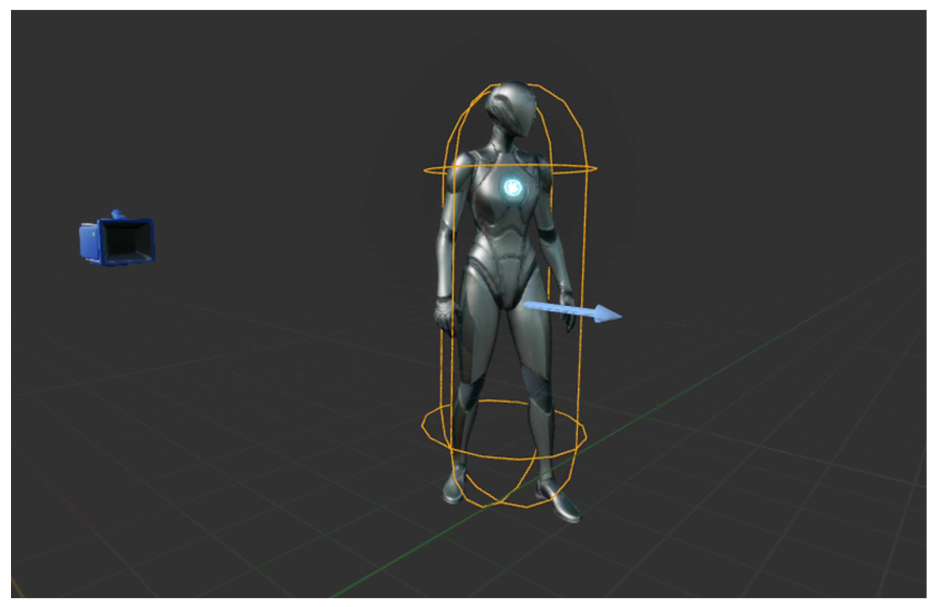Figure 17. Character collision capsule (orange) and arrow component for direction (blue).