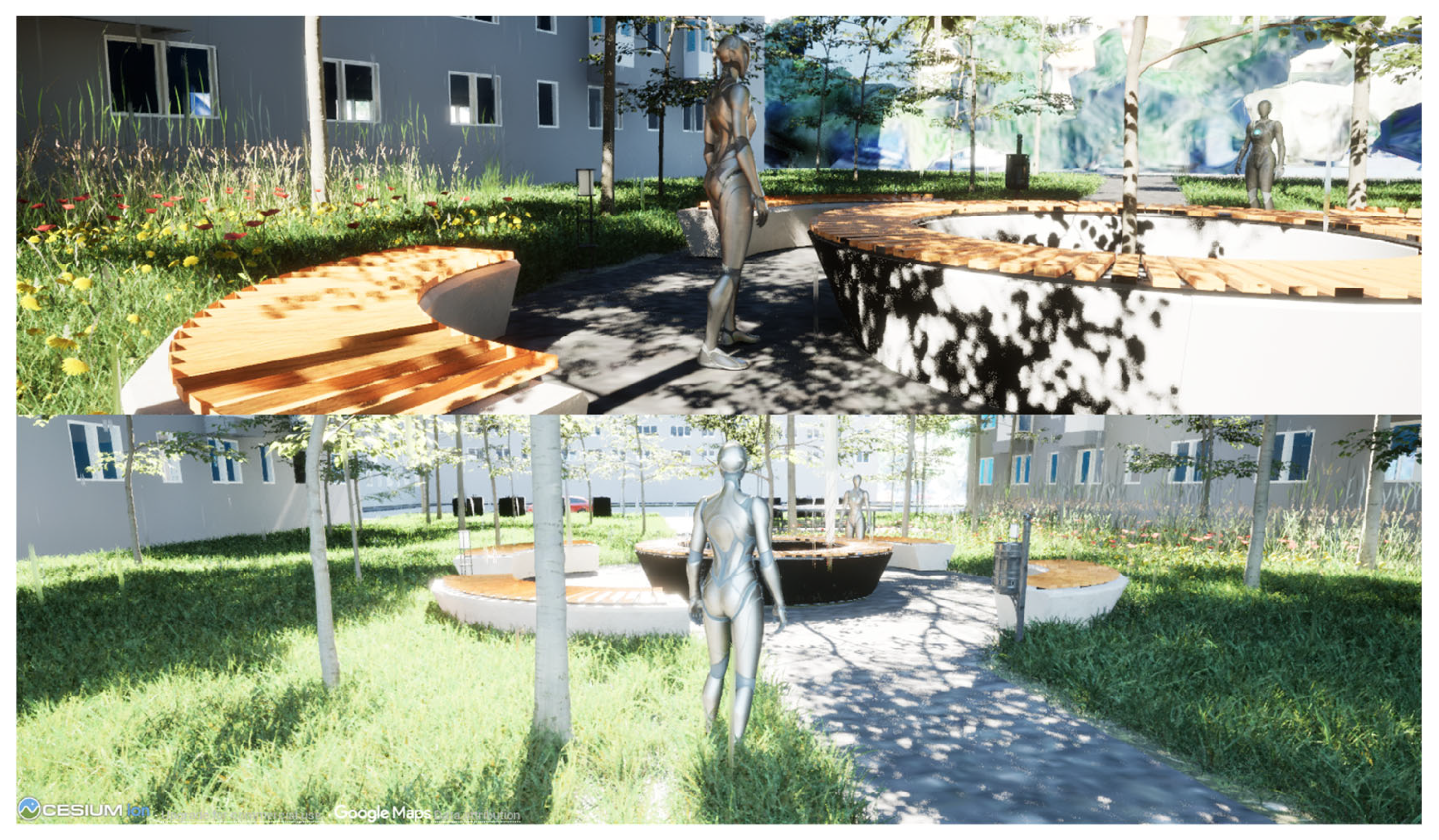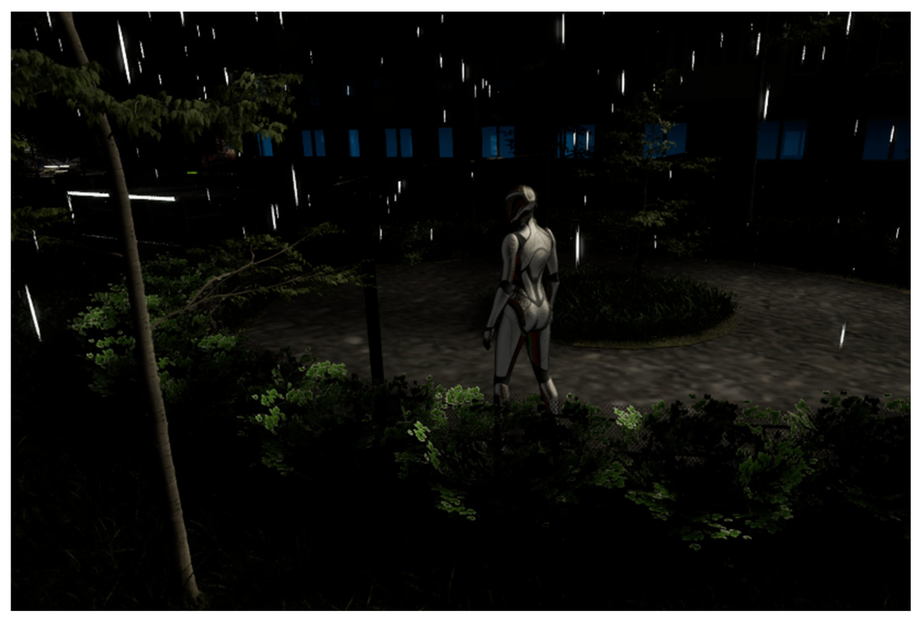 Based on the two scenarios illustrating the existing and proposed situations, a night scene was added to underscore the game engine’s visual potential to recreate real-life phenomena. Weather visual effects in Niagara VFX and Cesium ion tools were used to develop two scenarios using the local time zone. Figure 21 and Figure 22 illustrate the current state of the courtyard on a sunny spring day (time: 1:00 p.m., date: 5 March 2024) and a rainy winter night (time: 10 p.m., date: 24 December 2024). Figure 23 and Figure 24 depict the second scenario, including a lighting proposal for the courtyard with pathway lights. This simulation reinforces the dashboard’s conclusion that there is insufficient outdoor lighting in the area.