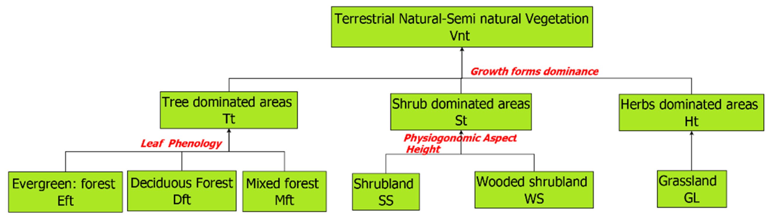 | Vnt/Tree-Dominated Area (Tt) | A12 (Natural Terrestrial Vegetation) | 3.1.1 (Broad-leaved Forest) | 40 (Closed to Open Broad-leaved Evergreen Forest) | LLCRS adds explicit height and phenology constraints for arid-adapted forests. |