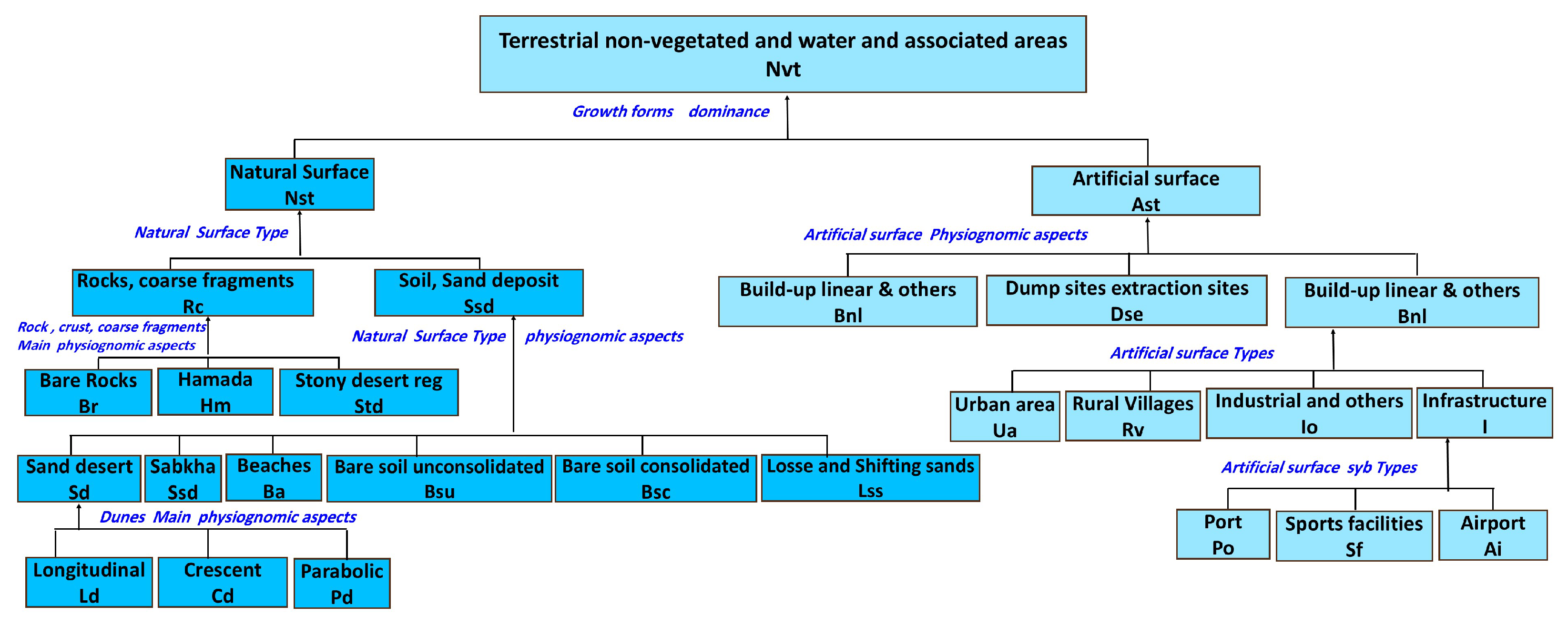 | Natural Surfaces (Non-Vegetated)—Sn | Rocks, Coarse Fragments—Tr | Physiognomic Aspect: Bare Rocks/Hammada/Stony Desert (Desert Pavement) | Desertification tracking (stony pavement formation), geological mapping, soil accessibility assessment | Add detailed rock type (limestone, basalt), soil crust type, surface roughness |