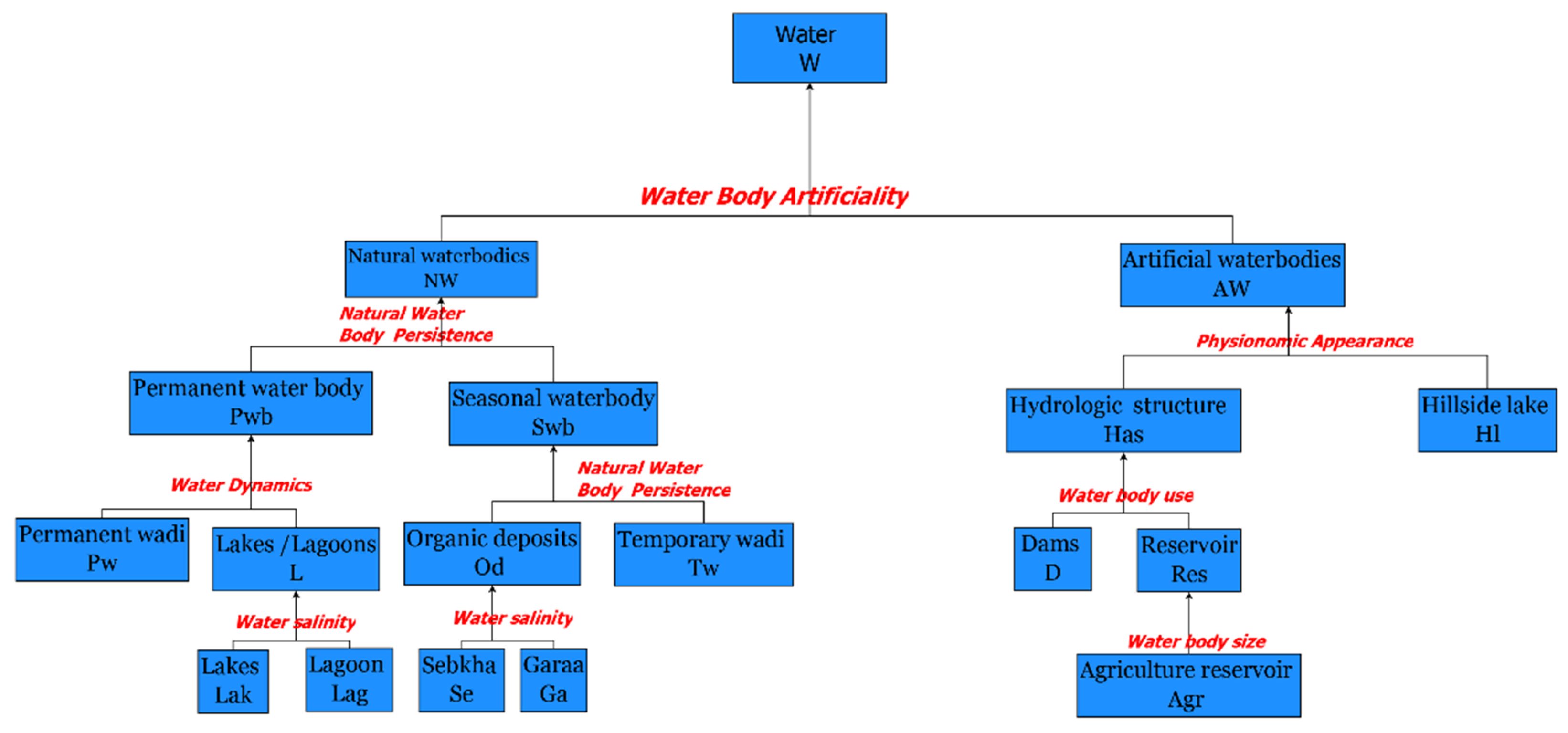 | Waterbodies—NW | Permanent Water Body—Pwb | Dynamics: Standing/Flowing; Salinity: Fresh/Brackish/ Saline; Depth: >2 m | Water resource inventory, reservoir monitoring, aquatic ecosystem health assessment | Add water depth variability, seasonal turbidity, shoreline stability |
