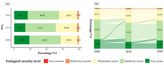 Variations in the area percentage of ecological security categories from 2000 to 2020. (a) Temporal variation in the proportion of different ecological security levels; (b) Sankey diagram illustrating the dynamic transfer directions and flow magnitudes between security levels from 2000 to 2020.
