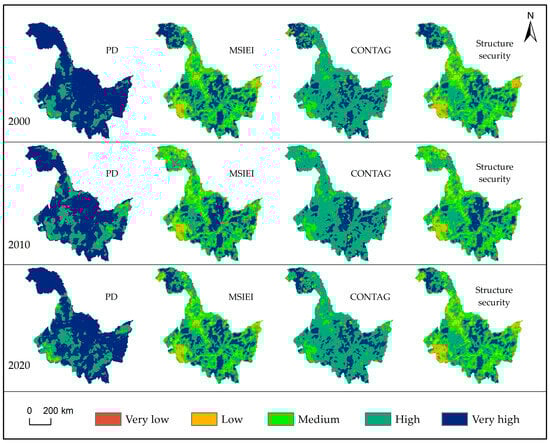 As shown in Figure 6, we analyzed the dynamics of structural ecological security (represented by habitat fragmentation risk) utilizing normalized PD, MSIEI, and CONTAG indices. Following normalization, higher values for all indicators indicate a higher level of structural ecological security and a correspondingly lower risk of habitat fragmentation.