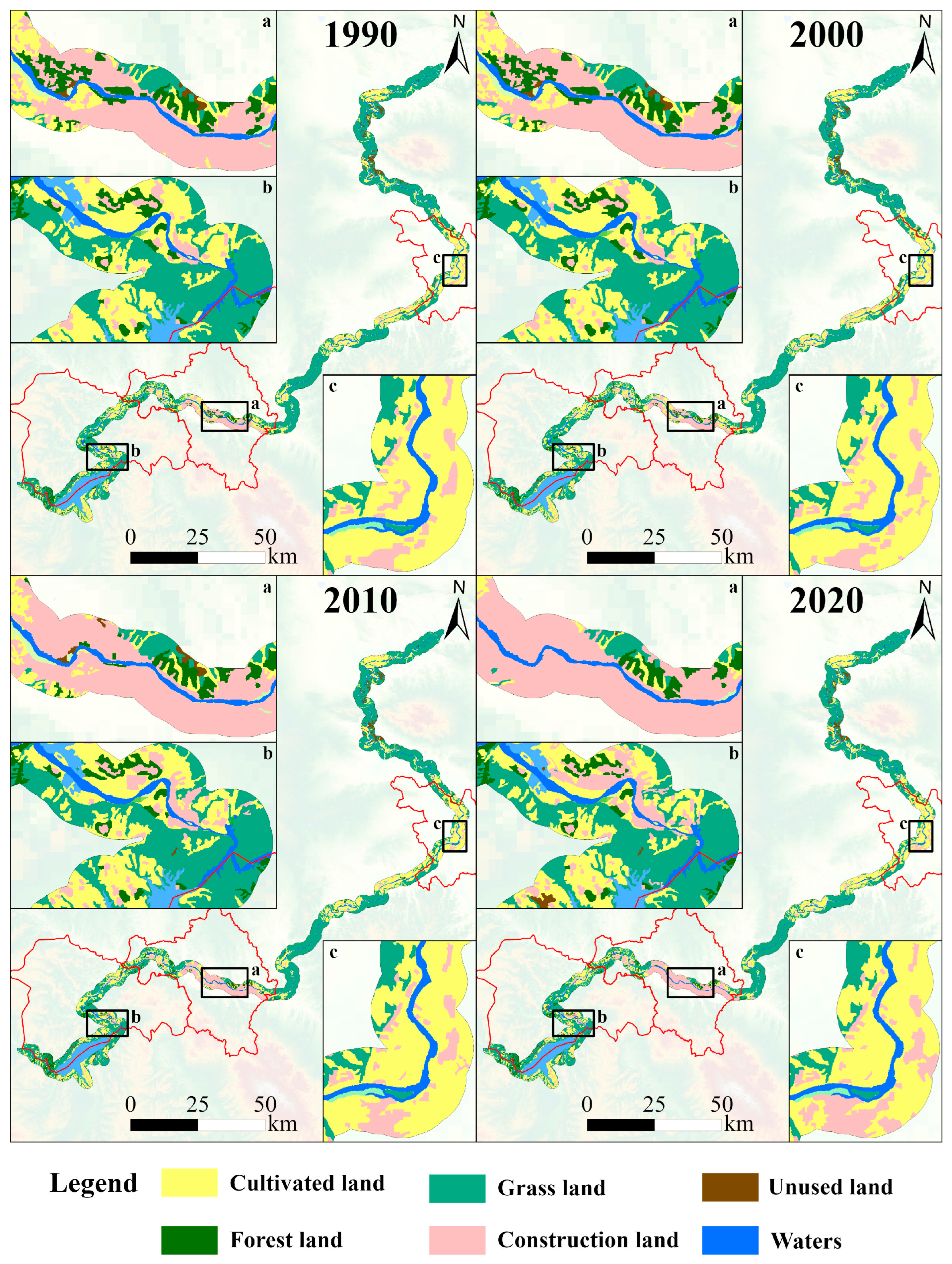 | Remote sensing satellite monitoring data | Land use and cover change | Resource and Environmental Science Data Platform (https://www.resdc.cn/) accessed on 8 June 2025 | Raster (30 m) |
