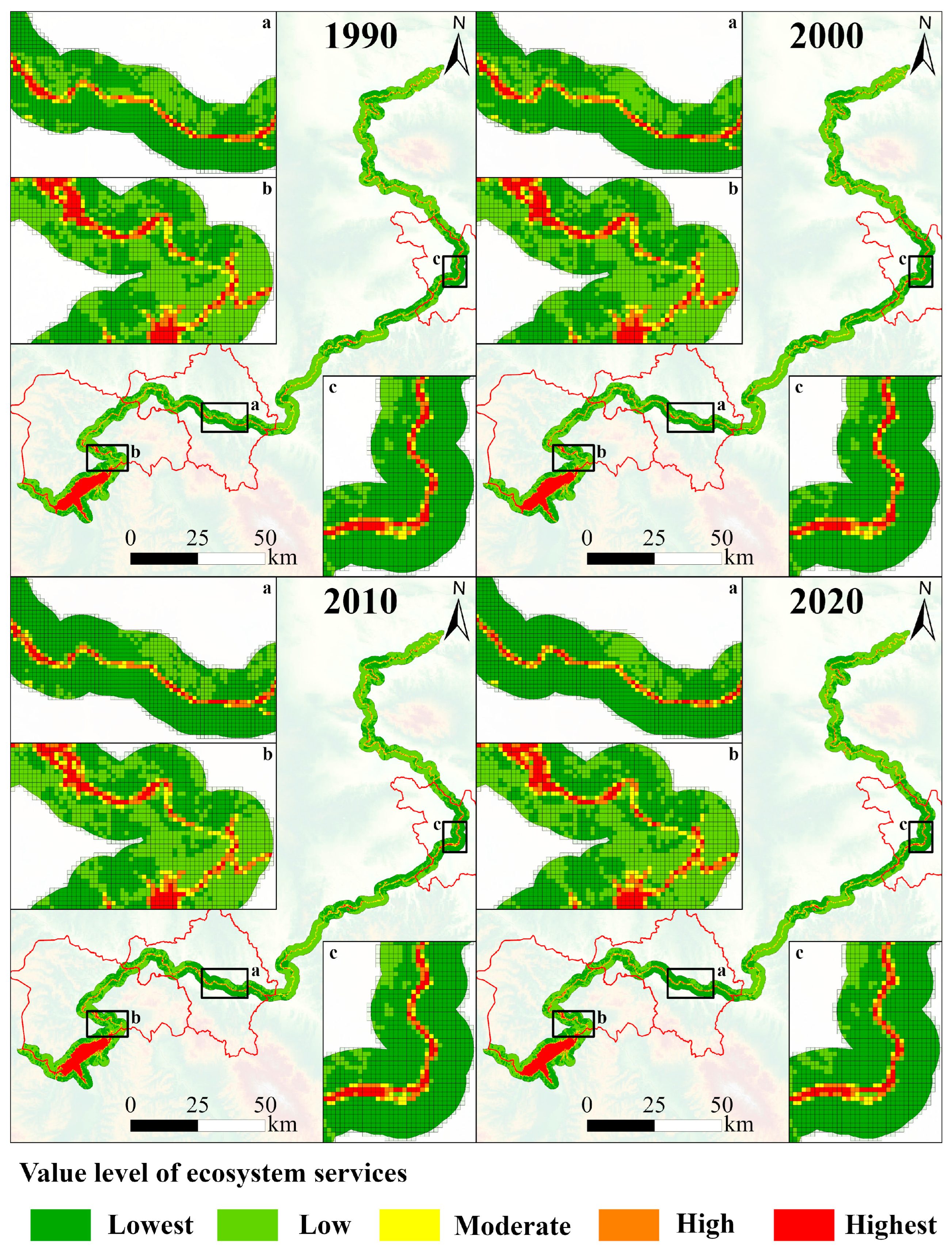 - Yang, J.; Xie, B.; Zhang, D. Spatial–temporal evolution of ESV and its response to land use change in the Yellow River Basin, China. Sci. Rep. 2022, 12, 13103. [Google Scholar] [CrossRef] [PubMed]