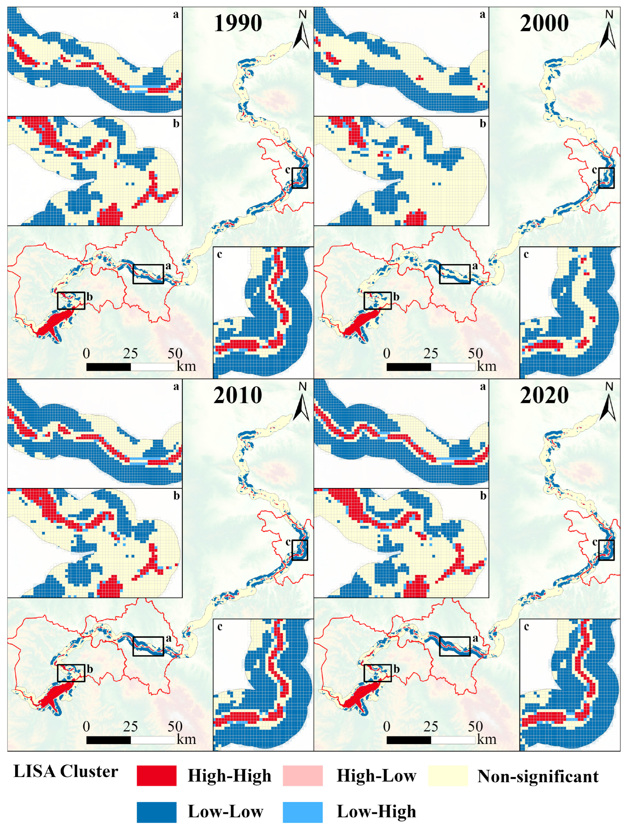 - Lee, S.-I. Developing a bivariate spatial association measure: An integration of Pearson’s r and Moran’s I. J. Geogr. Syst. 2001, 3, 369–385. [Google Scholar] [CrossRef]