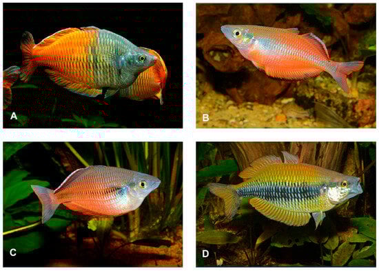 Within Western New Guinea (Bird’s Head and Bird’s Neck), there is a complex of Melanotaenia species with similar morphology and coloration. A number of these species occur in the region near Lake Ayamaru, e.g., Melanotaenia ajamaruensis, M. boesemani, M. ericrobertsi, M. fasinensis, M. longispina, M. susii and M. klasionensis (referred to as the species from Central Ayamaru Plateau according to [32]) Others, such as M. arfakensis, M. irianjaya, M. veoliae, M. laticlavia, M. multiradiata, and M. wanoma, occur more broadly across the Birds Head region. Several species are endemic to the isthmus between the Birds Head and the Birds Neck, such as M. angfa, M. parva, M. sikuensis, M. manibuii, and others. Finally, there is a group of species endemic to the Bird’s Neck, namely three species of the “Goldiei group” that apparently migrated from the South (M. goldiei and related species typically occurr in the South of New Guinea with their “sister” species complex, the “Trifasciata group” from Northern Australia) through the Omba–Woromi corridor, a low elevation (up to 160 m) area linking the respective southern and northern drainages [33] along with their close southern relatives: M. bowmani, M. etnaensis, M. dumasi, M. grunwaldi, M. lacunosa and M. mamahensis. The Bird’s Head region and the adjacent Bird’s Neck of West Papua are hot spots for recent discoveries. A summary provided by ref. [34] included the seven species known to inhabit the Bird’s Head mainland at that time. Using DNA barcoding, ref. [30] found exceptionally high levels of cryptic diversity and endemism in the Bird’s Head and Bird’s Neck regions. Their analyses revealed nearly 30 distinct evolutionary lineages within the 15 nominal rainbowfish species sampled, with all detected lineages restricted to a single lake or watershed. Currently, 37 described species, plus several undescribed forms, are known from the region. In this study, we include the 37 described species as well as six species from the nearby islands of Rumberpon, Waigeo, Salawati, Batanta, and Misool (Figure 1, Table 1) for a total of 43 species. For M. irianjaya (Figure 1, map #44), a species widespread north and south of Bintuni Bay [35], we also include a second sampling location (M. cf. irianjaya; Figure 1, map #17) based on specimens collected by author H.G.E. in 2013. Several rainbowfish species are widely represented in the aquarium hobby [30], with examples of four commonly traded species shown in Figure 2.