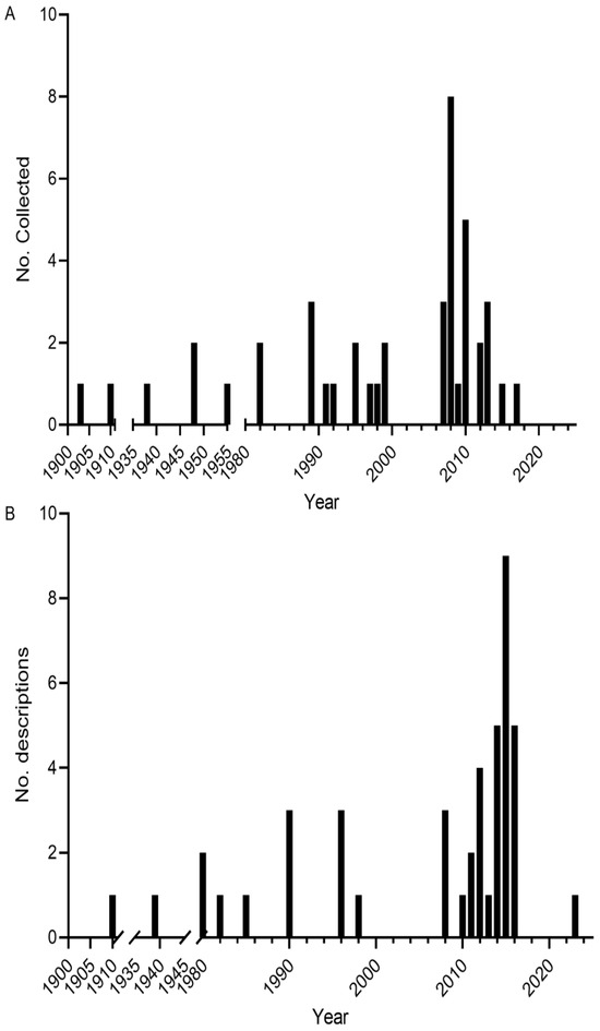 (A) Number of Melanotaenia type specimens from the study area collected per year; (B) number of Melanotaenia species described per year.
