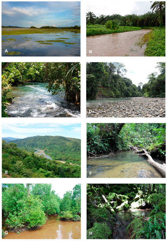 Examples of rainbow fish habitats in the study area: (A) Lake Ayamaru, home to M. boesemani. (B) Prafi River near Manokwari, type locality of M. arfakensis. (C) The Kali Alawit creek in the Central Ayamaru Plateau, habitat of M. ajamaruensis. (D) Braidplain of the Sungai Mega stream in the Tamrau Mountains, habitat of M. ericrobertsi. (E) Primary forest is still commonly found surrounding rivers on the Bird’s Head Peninsula. (F) The Kali Aitafoh in the Ayamaru District drains the foothills of the Tamrau mountains. (G) Mangroves north of Sorong. (H) Many creeks and rivers on the Central Ayamaru Plateau are spring water, flowing over ground for just a few kilometers before going underground again. The soft limestone of this karst region covers a labyrinth of caves and underground waterways.
