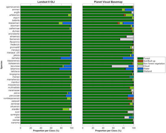 In this study, we assess land cover change surrounding the type localities of 43 rainbowfish species endemic to the Bird’s Head and Bird’s Neck region of Western New Guinea, within 5 km and 300 m spatial buffers. Previous remote sensing studies have mapped land cover and forest change broadly across Western New Guinea (e.g., [16,17,18,19,20,21]); however, these analyses have not been explicitly designed to evaluate habitat change at spatial scales relevant to narrowly distributed freshwater taxa. Forest loss in the region is primarily associated with timber extraction, oil palm expansion, and agriculture [19]. Due to persistently high cloud cover [22], we first generated a baseline high spatial resolution land cover classification using a low-cloud Planet Labs quarterly basemap mosaic and compared it to a classification derived from moderate resolution Landsat 8 OLI imagery to evaluate how spatial resolution influences the detection of change. We then used the full 40-year Landsat archive to produce three decadal change analyses (within 5 km buffers) and to identify localized disturbance events within 300 m buffers that may affect rainbowfish habitat conditions (e.g., via altered thermal regimes). For species inhabiting large rivers and lakes, where small-area buffers are less informative, we instead quantified changes in waterbody extent. Our study underscores the importance of multi-scale spatial and temporal analyses in this understudied yet highly biodiverse region [23]. The approaches presented here are broadly applicable and could be used to assess habitat change for other narrowly distributed endemic plant and animal taxa.