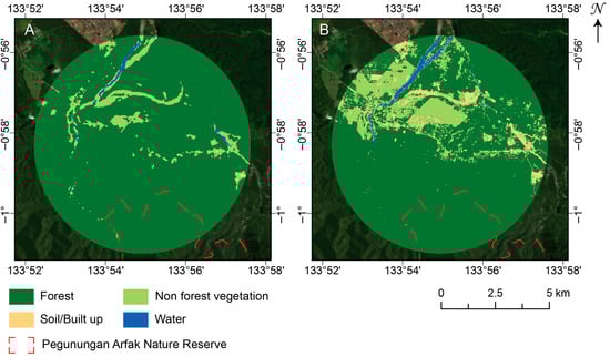 - Gaveau, D.L.A.; Santos, L.; Locatelli, B.; Salim, M.A.; Husnayaen, H.; Meijaard, E.; Heatubun, C.; Sheil, D. Forest loss in Indonesian New Guinea (2001–2019): Trends, drivers and outlook. Biol. Conserv. 2021, 261, 109225. [Google Scholar] [CrossRef]
