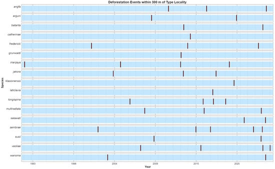 Rainbowfish of the genus Melanotaenia are highly endemic freshwater fishes found only in Australia and New Guinea. Although widespread, most species have narrow geographic ranges, making them particularly vulnerable to environmental change. Currently, 43 described (and many undescribed) Melanotaenia species occur in the Bird’s Head and Bird’s Neck region of Western New Guinea, 29 of which are currently classified as critically endangered, endangered, or vulnerable by the IUCN Red List, including two that may be extinct in the wild. We generated a high-spatial-resolution baseline land cover classification of rainbowfish habitats using low-cloud Planet Labs quarterly basemap mosaics and compared it with a moderate-resolution Landsat 8 OLI-derived classification to assess how spatial resolution influences land cover classification. Using the full 40-year Landsat archive, we quantified decadal land cover change around species type localities and identified localized disturbance events that may affect rainbowfish habitats. For species described from large rivers and lakes, changes in water-body extent over time were quantified. Deforestation varied widely, ranging from little or no detectable change in remote, difficult-to-access locations (e.g., M. misoolensis, M. sneideri), to landscapes heavily modified by logging, urbanization, mining, and agriculture (e.g., M. boesemani, M. arfakensis). Around the type localities, from the high-resolution imagery, we detected ~2939 ha of cleared land, whereas from the Landsat classification we identified only 31 ha of clearing, indicating that most of the fine-scale deforestation was not resolved at the Landsat scale. Time-sequence analyses indicate that over one-third of type localities experienced one or more localized disturbance events over the last 40 years. Land cover change in this region is highly dynamic and differs from commonly studied frontier deforestation patterns elsewhere. It also underscores a critical conservation challenge where rainbowfish species are being discovered in landscapes that are simultaneously undergoing rapid, spatially heterogeneous change. The same infrastructure that enables biological exploration also accelerates habitat modification. These changes threaten the persistence of highly endemic rainbowfish and underscore the value of multi-scale spatial and temporal remote sensing approaches for assessing habitat change in remote, biodiverse regions. The framework presented here is also broadly applicable to other narrowly distributed endemic taxa.