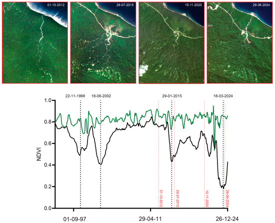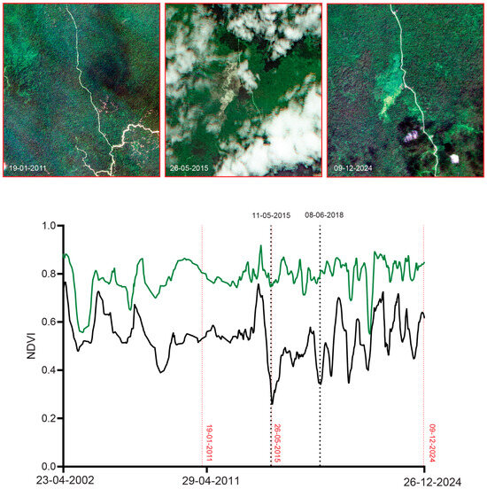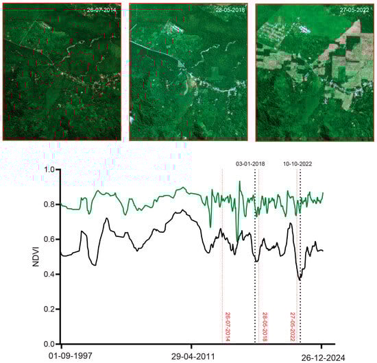 Satellite time-sequence analysis of land cover and land use change (e.g., forest vs. non-forest) is a crucial approach for understanding how landscapes evolve over time due to both natural dynamics (e.g., wildfires, forest gaps) and human activities (e.g., deforestation, urban development) [10,11]. Long-term archived satellite imagery provides consistent, repeatable, and broad-scale observations of the Earth’s surface, making it an invaluable tool for monitoring land cover change across different temporal (years to decades) and spatial scales (local to landscape). The Landsat series’ extensive archives, spanning over 50 years of digital, multispectral (four to seven spectral bands) imagery at medium spatial resolution (30 m), are the most widely used Earth observation (EO) dataset for satellite image time-series analysis [12]. This wealth of EO data from Landsat provides consistent surface reflectance suitable for applying diverse time-series methods and has been widely used worldwide across different applications and geographic locations [13]. Given the medium spatial resolution from Landsat, applications involving features below a small minimum mapping unit [14], or those requiring very high temporal resolution (e.g., to overcome persistent cloud cover in tropical regions), can benefit from newer commercial EO systems such as the Planet Dove constellation, which provides satellite imagery dating back to 2016 with near-daily revisit times at a spatial resolution of ~4 m [15].