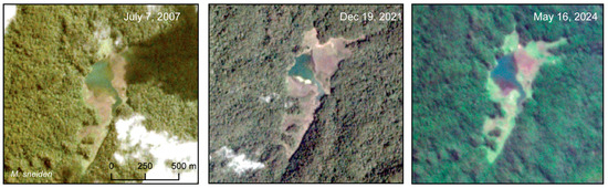The global quarterly cloud-minimized basemap is a mosaic constructed from best-available daily PlanetScope imagery using automated cloud and haze masking and is optimized for human viewing and computer vision analytics [39]. It was used to create the high-spatial resolution baseline land cover classification (Section 2.4.1). The PlanetScope constellation consists of more than 430 triple-CubeSats (i.e., miniature satellites). The Dove-R satellites within that constellation have acquired four-band multispectral imagery from blue to near-infrared wavelengths since 2019, while the SuperDoves have acquired eight band imagery within the same spectral range since 2020 [40,41]. Analytic surface reflectance images orthorectified to a 3 m pixel size were used here. The RapidEye constellation, operational from 2009 to 2020 [42], comprised five multispectral satellites, which acquired five bands from blue to near-infrared wavelengths [43]. The orthorectified, atmospherically corrected imagery used here has a pixel size of 5 m. The PlanetScope and RapidEye images were used for the surface water extent analysis (Section 2.6) and for visualization of small-scale deforestation events from the time-sequence analysis (Section 2.5).
