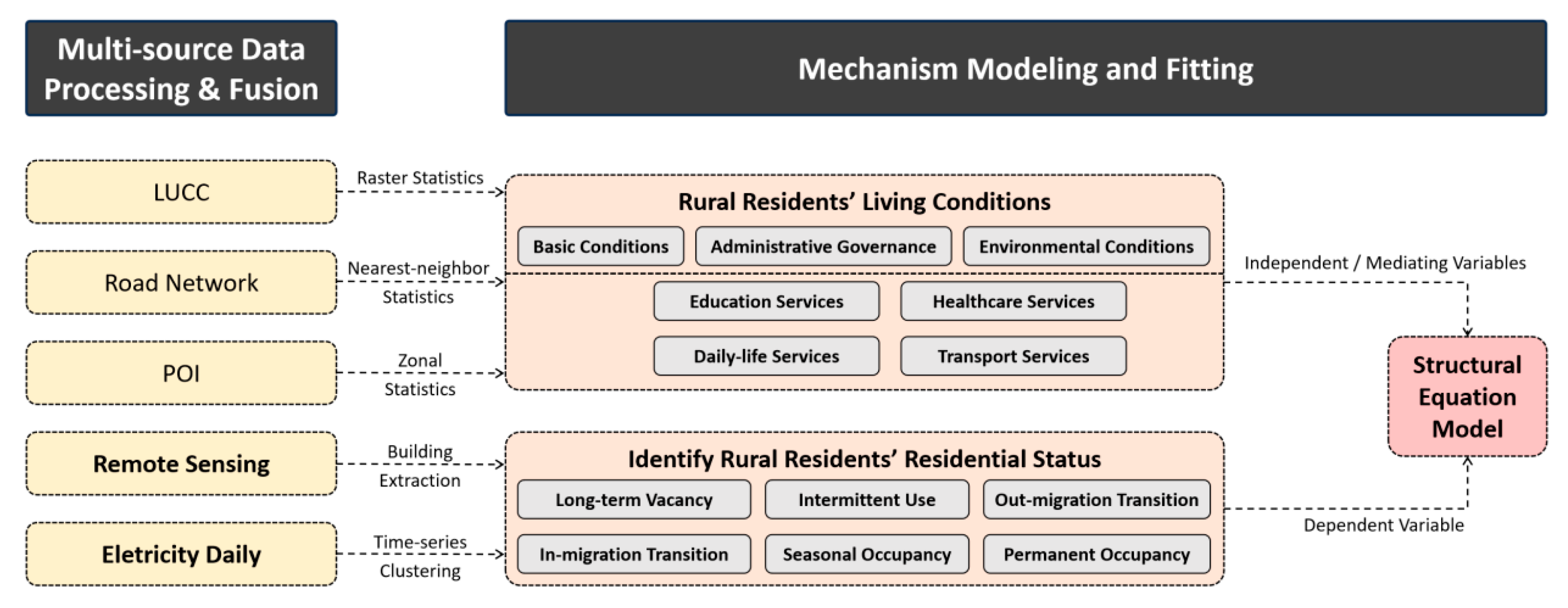 To identify explainable mechanisms behind occupancy dynamics, we specified a structural equation model that links contextual conditions to residence stability through service accessibility as a mediating pathway. The model includes a measurement component and a structural component. The measurement model defines latent constructs for development conditions, governance capacity, environmental constraints, and service accessibility by using multiple observed indicators derived from the multi-source dataset described in