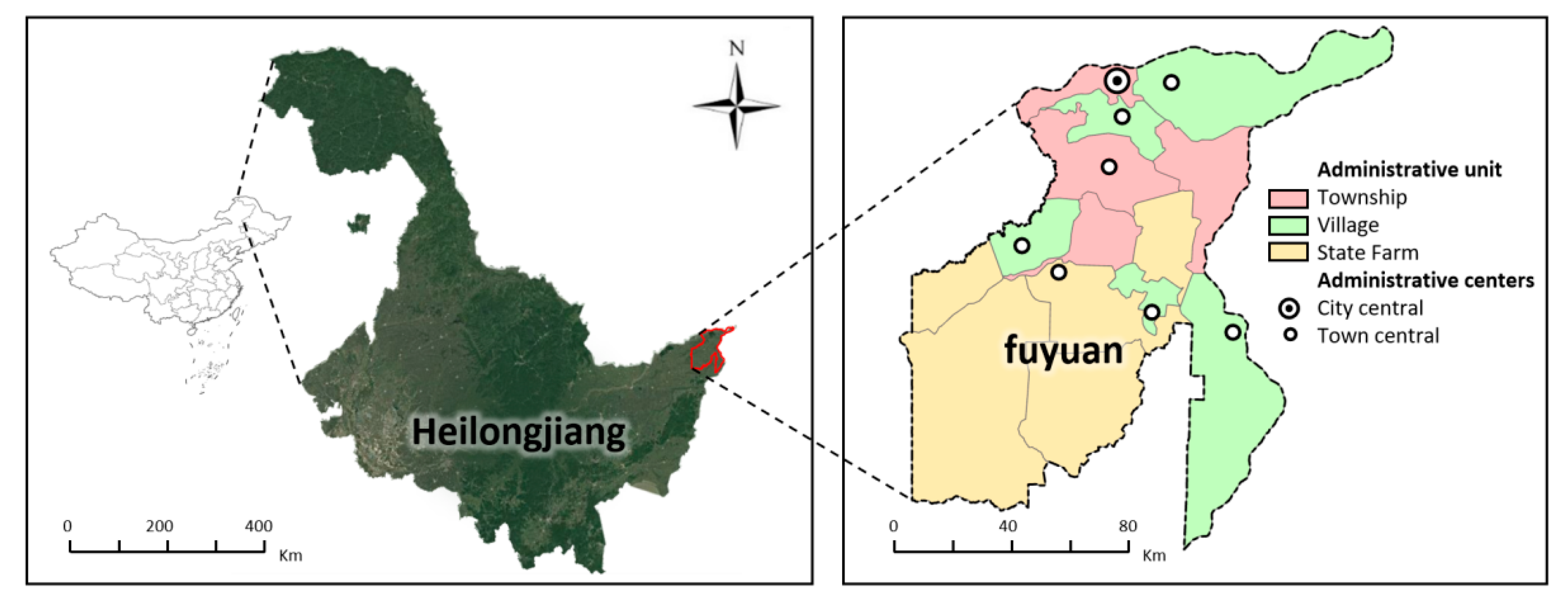 28]. Consistent with many county-level areas in Northeast China, rural settlements in Fuyuan include both administrative villages and state-farm (agricultural reclamation) units; therefore, this study considers both unit types in the study area description and subsequent settlement-scale analysis. Consistent with many county-level areas in northeast/northern China, rural settlements in Fuyuan include both administrative villages and state-farm (agricultural reclamation) units; therefore, this study considers both unit types in the study area description and subsequent settlement-scale analysis.