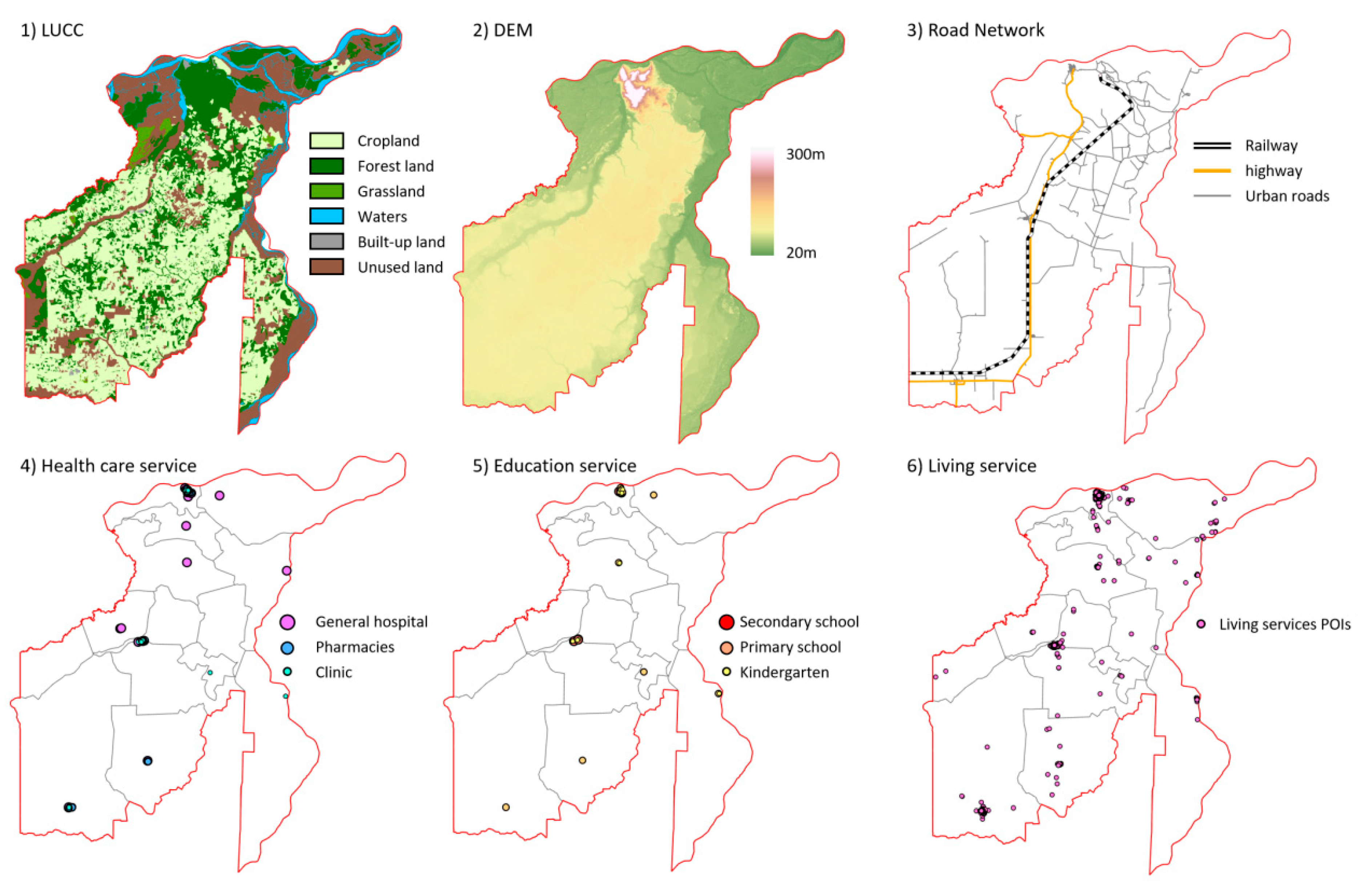 Figure 3). High resolution remote sensing imagery with 2 m spatial resolution was mosaicked where necessary to achieve continuous coverage, screened to remove invalid pixels, and clipped to the administrative boundary of Fuyuan City. POI data were cleaned by removing duplicates, harmonizing category labels, and retaining service-related records that were consistent with the service accessibility mediators used in the mechanism model, including education, healthcare, transport-related facilities, and daily life services. Road network data were extracted and processed to improve topological usability by removing non-road artifacts, correcting obvious geometric errors when present, and retaining road classes that were relevant for accessibility characterization. Land use and land cover rasters were reprojected and aligned to the analysis grid, then prepared for zonal statistics. Elevation data were converted into analysis ready rasters and used to derive basic terrain constraints, such as mean elevation and mean slope.