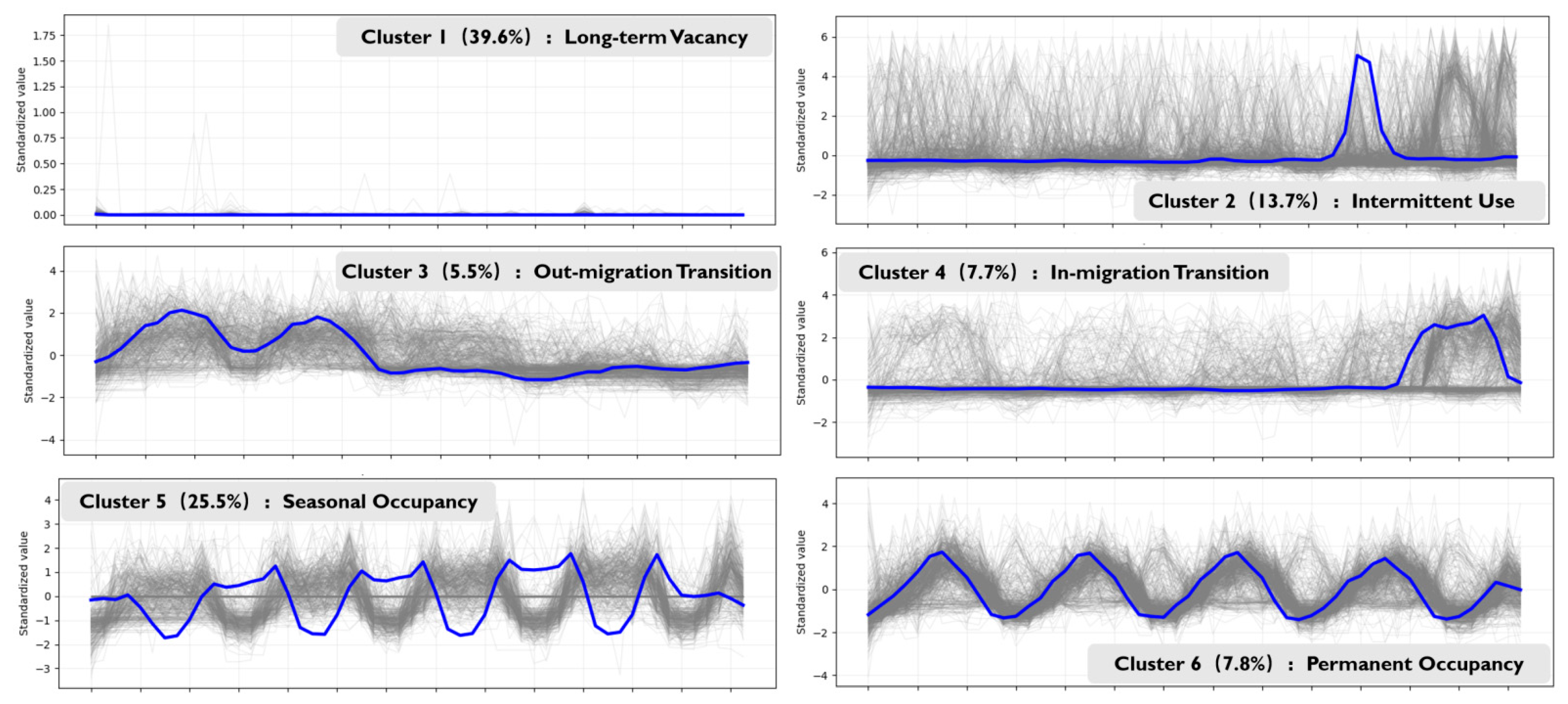 13]. Each monitored unit was assigned a trajectory label, which serves as the operational representation of occupancy dynamics and is used as the key outcome variable in the subsequent mechanism modeling. To support later structural modeling, the six trajectories were encoded as an ordered categorical indicator of residence stability, with the ordering defined by the degree of sustained year round use versus intermittent or near-zero use, based on the characteristic trajectory shapes shown in